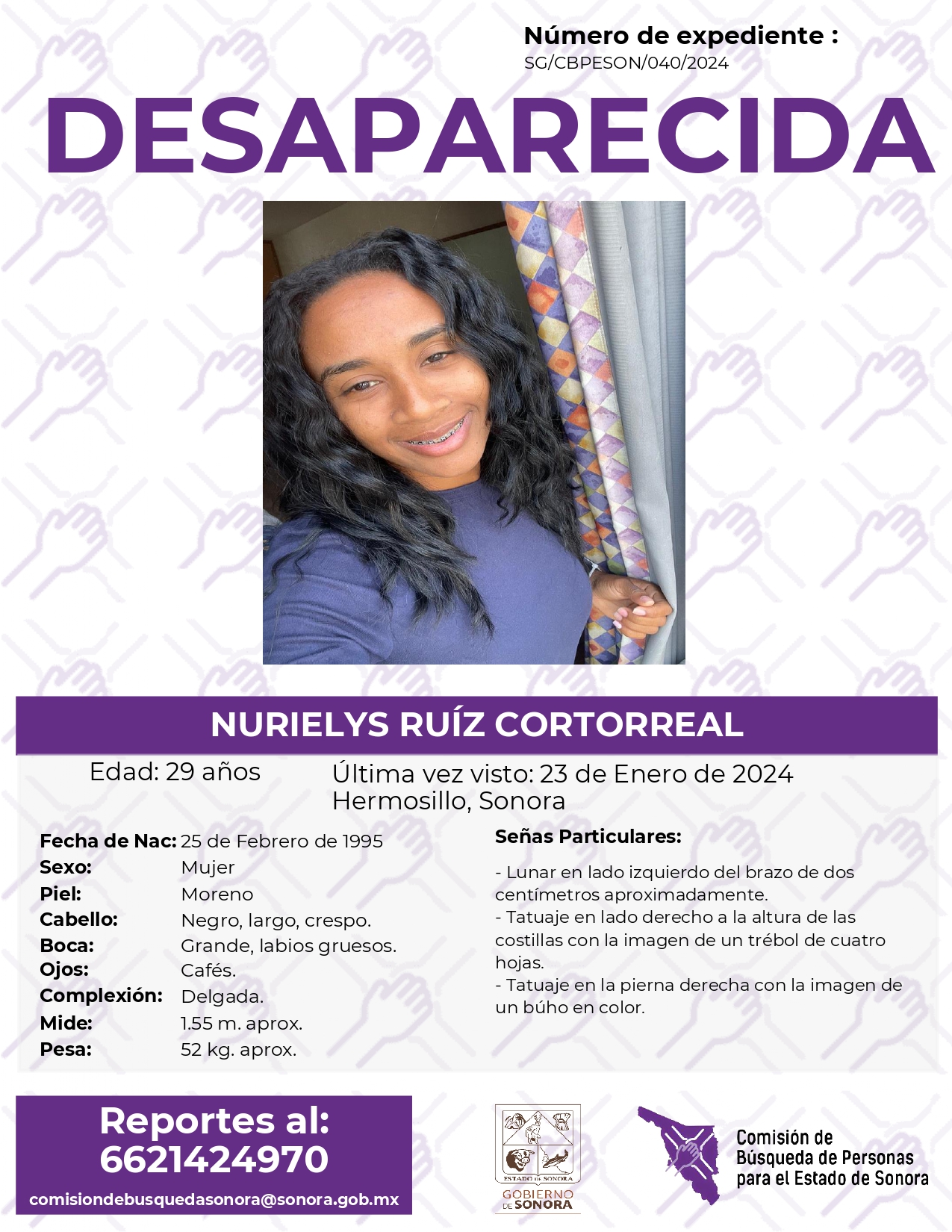 La Comisión de Búsqueda Para el Estado de Sonora solicita apoyo para localizar a NURIELYS RUÍZ CORTORREAL. Cualquier información, al correo y teléfono: Esta dirección de correo electrónico está siendo protegida contra los robots de spam. Necesita tener JavaScript habilitado para poder verlo. -6621424970 *La información será usada de manera anónima* "Toda persona tiene un hogar, ayudémosle a regresar". #desaparecidos #ComisiónDeBúsqueda #Sonora#Hermosillo