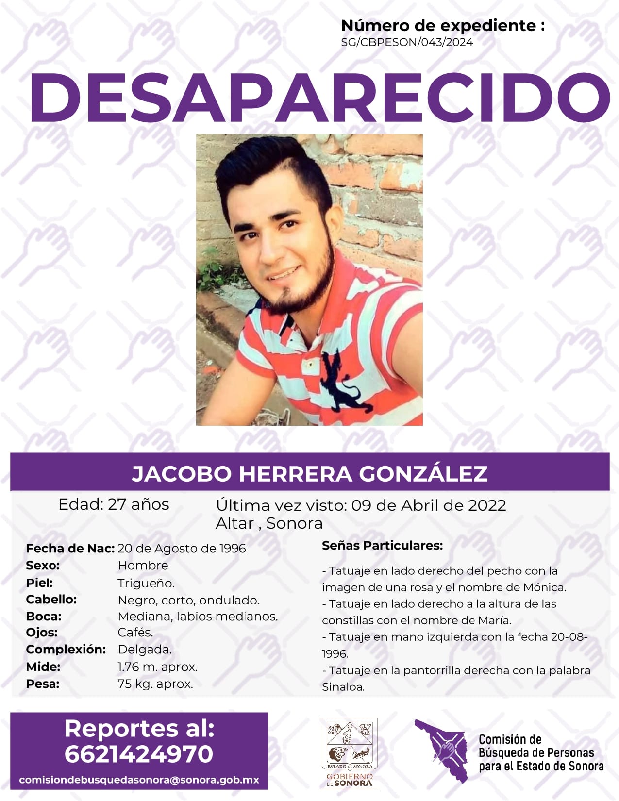 La Comisión de Búsqueda Para el Estado de Sonora solicita apoyo para localizar a JACOBO HERRERA GONZÁLEZ. Cualquier información, al correo y teléfono: Esta dirección de correo electrónico está siendo protegida contra los robots de spam. Necesita tener JavaScript habilitado para poder verlo. -6621424970 *La información será usada de manera anónima* "Toda persona tiene un hogar, ayudémosle a regresar". #desaparecidos #ComisiónDeBúsqueda #Sonora#AltarSonora