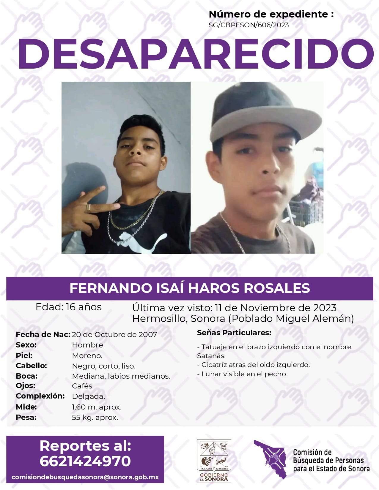 La Comisión de Búsqueda de Personas Para el Estado de Sonora solicita apoyo para localizar a FERNANDO ISAÍ HAROS ROSALES. Cualquier información, al correo y teléfono: Esta dirección de correo electrónico está siendo protegida contra los robots de spam. Necesita tener JavaScript habilitado para poder verlo. -6621424970 *La información será usada de manera anónima* "Toda persona tiene un hogar, ayudémosle a regresar". #desaparecidos #ComisiónDeBúsqueda #Sonora#Hermosillo