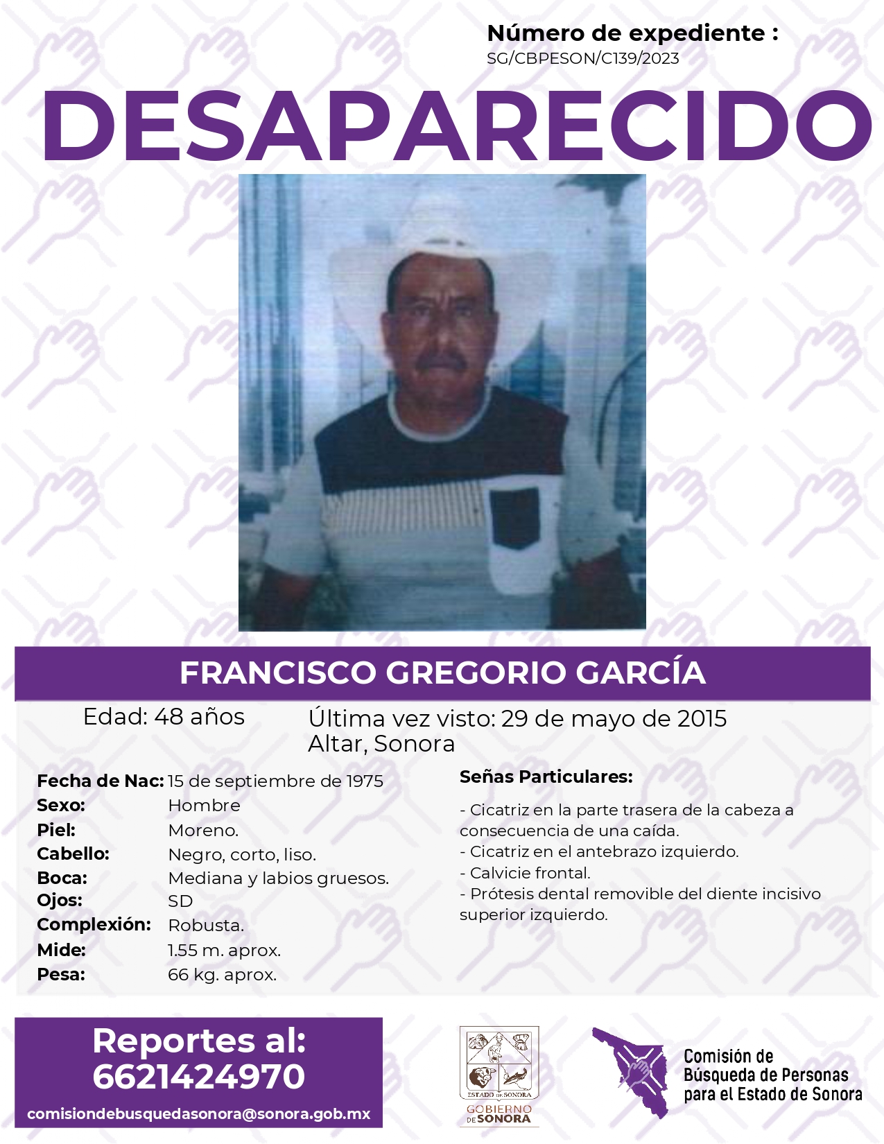 La Comisión de Búsqueda de Personas Para el Estado de Sonora solicita apoyo para localizar a FRANCÍSCO GREGORIO GARCÍA. Cualquier información, al correo y teléfono: Esta dirección de correo electrónico está siendo protegida contra los robots de spam. Necesita tener JavaScript habilitado para poder verlo. -6621424970 *La información será usada de manera anónima* "Toda persona tiene un hogar, ayudémosle a regresar". #desaparecidos #ComisiónDeBúsqueda #Sonora#AltarSonora