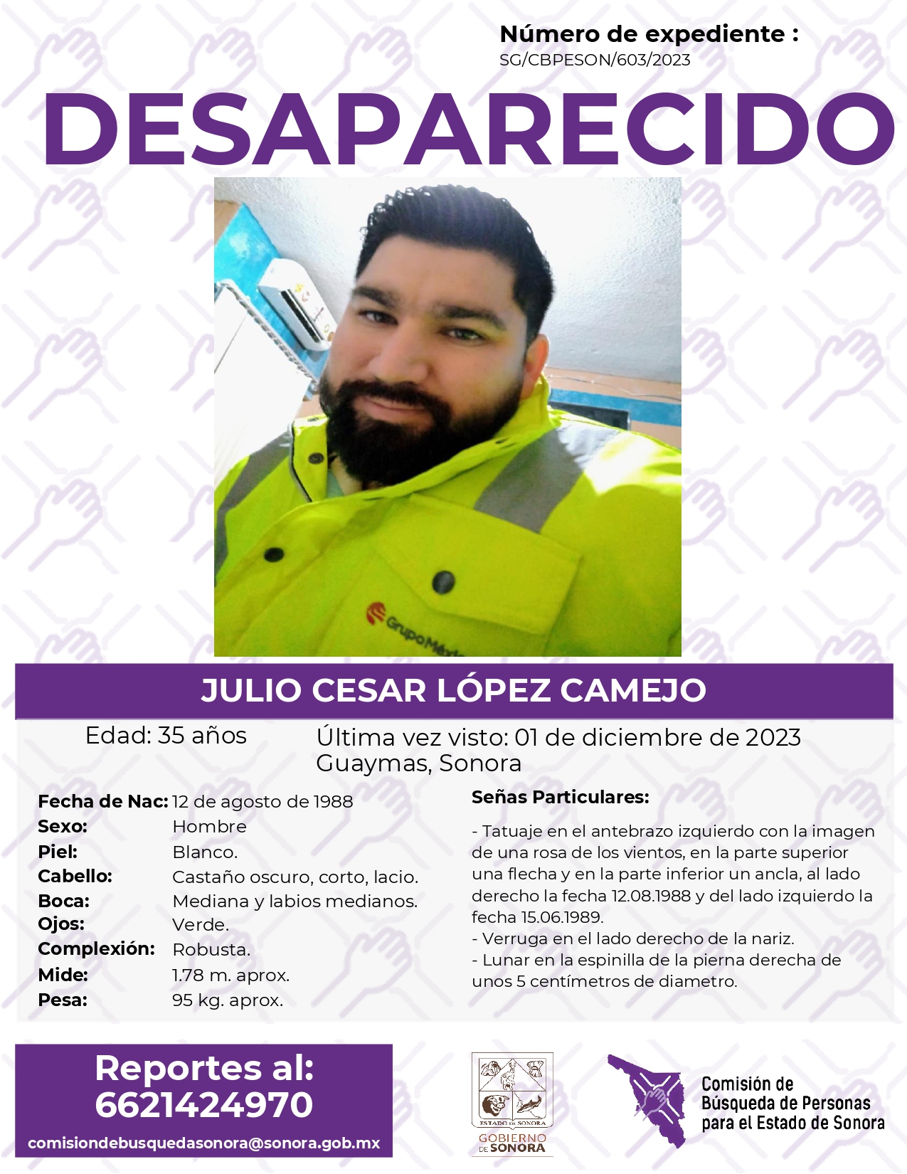 La Comisión de Búsqueda de Personas Para el Estado de Sonora solicita apoyo para localizar a JULIO CESAR LÓPEZ CAMEJO. Cualquier información, al correo y teléfono: Esta dirección de correo electrónico está siendo protegida contra los robots de spam. Necesita tener JavaScript habilitado para poder verlo. -6621424970 *La información será usada de manera anónima* "Toda persona tiene un hogar, ayudémosle a regresar". #desaparecidos #ComisiónDeBúsqueda #Sonora#Guaymas