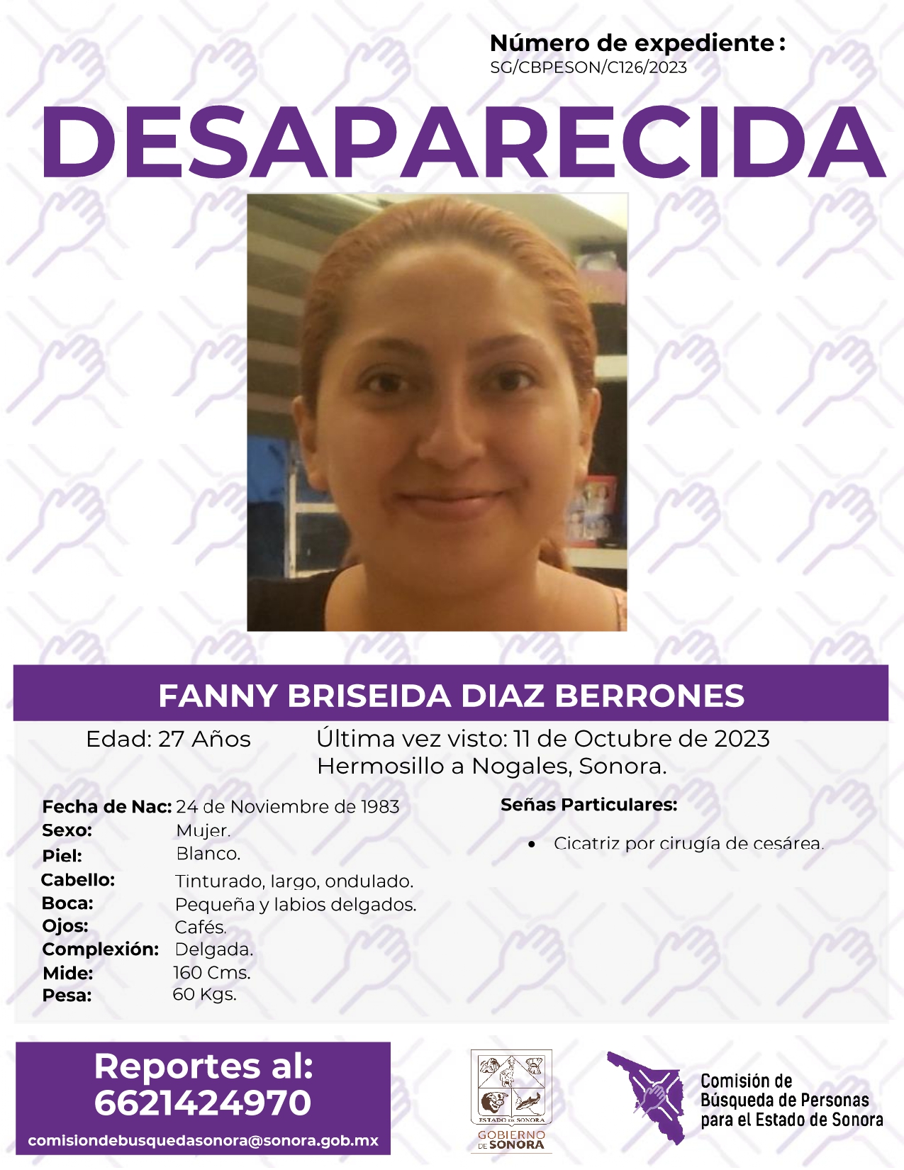 La Comisión de Búsqueda de Personas Para el Estado de Sonora solicita apoyo para localizar a FANNY BRISEIDA DÍAZ BERRONES. Cualquier información, al correo y teléfono: Esta dirección de correo electrónico está siendo protegida contra los robots de spam. Necesita tener JavaScript habilitado para poder verlo. -6621424970 *La información será usada de manera anónima* "Toda persona tiene un hogar, ayudémosle a regresar". #desaparecidos #ComisiónDeBúsqueda #Sonora#Nogales