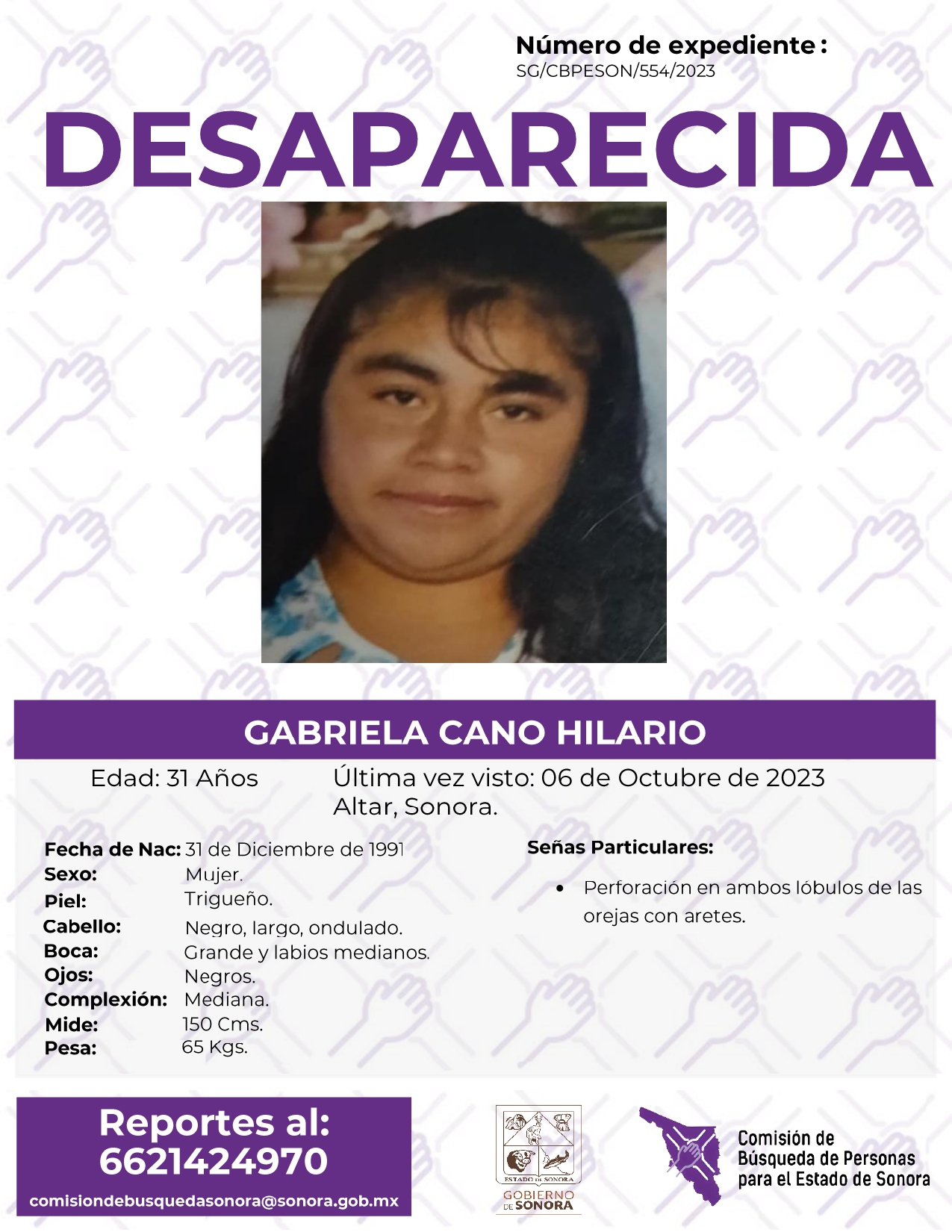 La Comisión de Búsqueda de Personas Para el Estado de Sonora solicita apoyo para localizar a GABRIELA CANO HILARIO. Cualquier información, al correo y teléfono: Esta dirección de correo electrónico está siendo protegida contra los robots de spam. Necesita tener JavaScript habilitado para poder verlo. -6621424970 *La información será usada de manera anónima* "Toda persona tiene un hogar, ayudémosle a regresar". #desaparecidos #ComisiónDeBúsqueda #Sonora#AltarSonora
