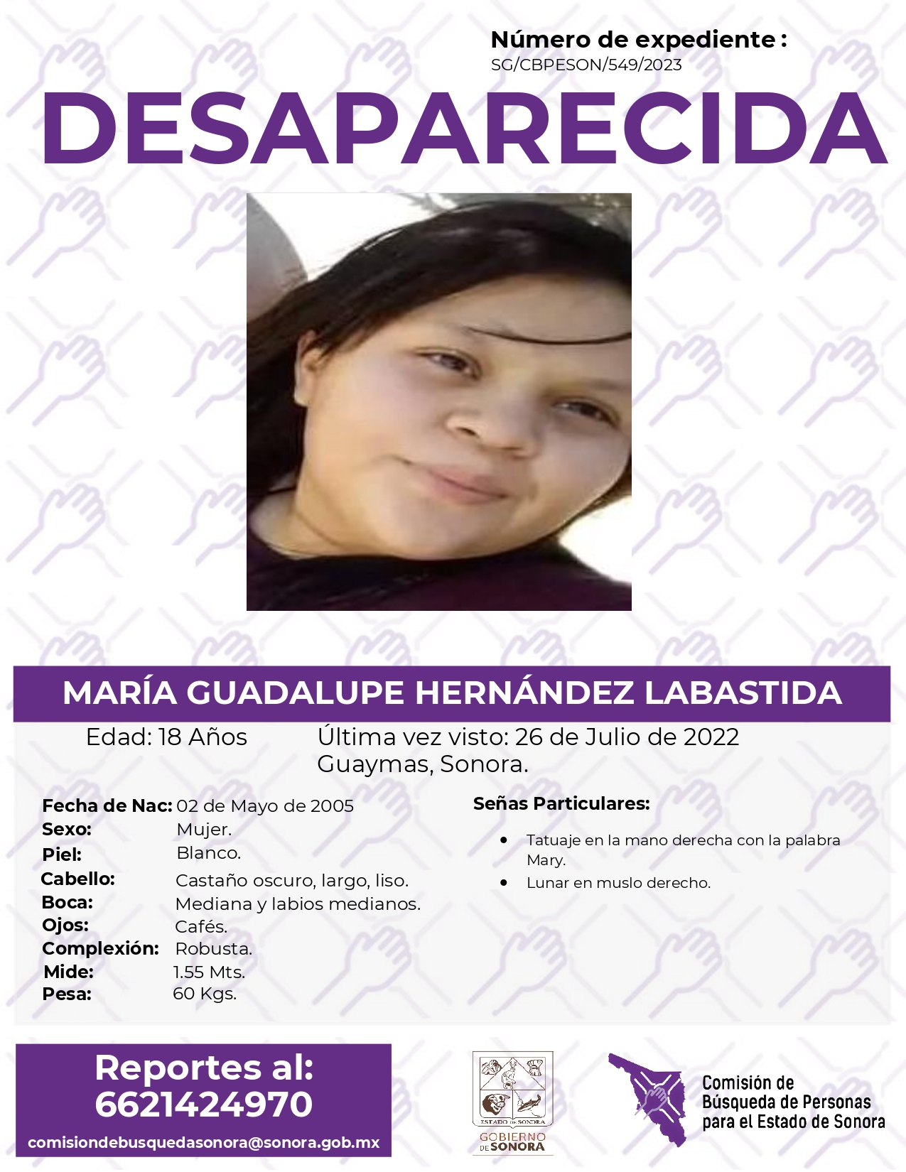 La Comisión de Búsqueda de Personas Para el Estado de Sonora solicita apoyo para localizar a MARÍA GUADALUPE HERNÁNDEZ LABASTIDA. Cualquier información, al correo y teléfono: Esta dirección de correo electrónico está siendo protegida contra los robots de spam. Necesita tener JavaScript habilitado para poder verlo. -6621424970 *La información será usada de manera anónima* "Toda persona tiene un hogar, ayudémosle a regresar". #desaparecidos #ComisiónDeBúsqueda #Guaymas#Sonora