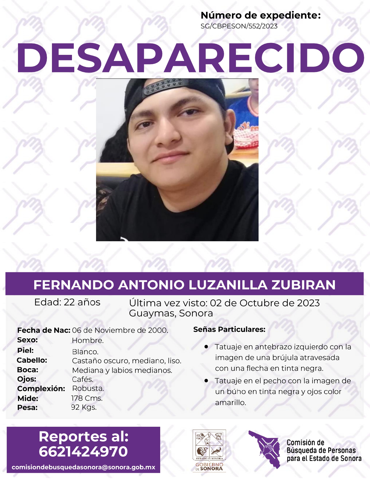 La Comisión de Búsqueda de Personas Para el Estado de Sonora solicita apoyo para localizar a FERNANDO ANTONIO LUZANILLA ZUBIRAN. Cualquier información, al correo y teléfono: Esta dirección de correo electrónico está siendo protegida contra los robots de spam. Necesita tener JavaScript habilitado para poder verlo. -6621424970 *La información será usada de manera anónima* "Toda persona tiene un hogar, ayudémosle a regresar". #desaparecidos #ComisiónDeBúsqueda #Guaymas#Sonora