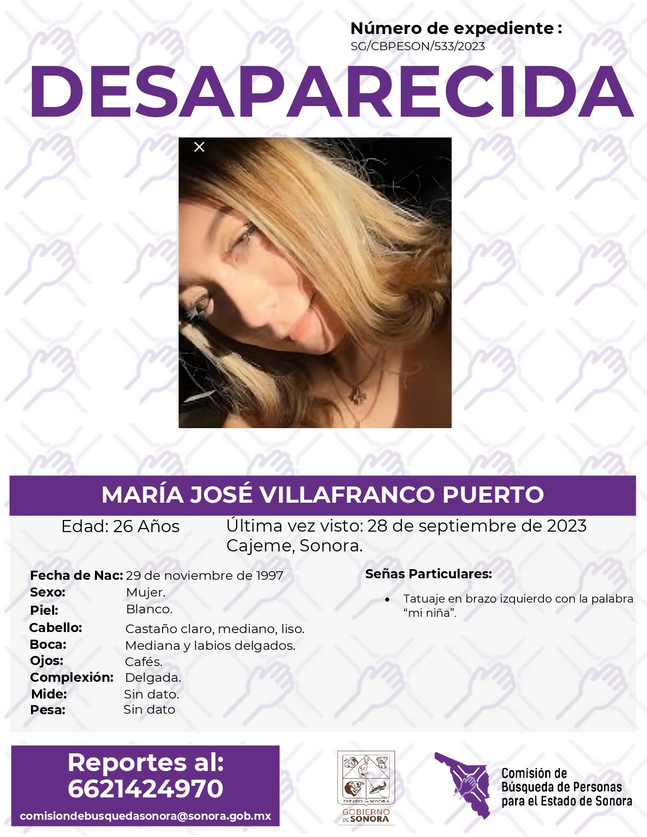 La Comisión de Búsqueda de Personas Para el Estado de Sonora solicita apoyo para localizar a MARÍA JOSÉ VILLAFRANCO PUERTO. Cualquier información, al correo y teléfono: Esta dirección de correo electrónico está siendo protegida contra los robots de spam. Necesita tener JavaScript habilitado para poder verlo. -6621424970 *La información será usada de manera anónima* "Toda persona tiene un hogar, ayudémosle a regresar". #desaparecidos #comisióndebúsqueda