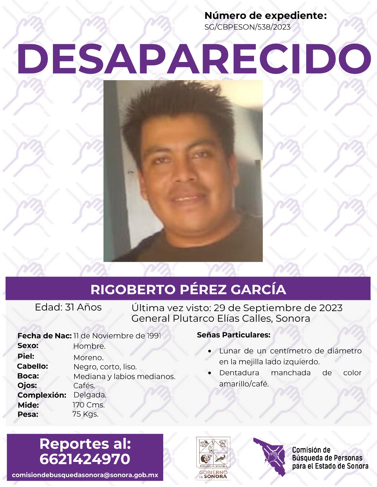 La Comisión de Búsqueda de Personas Para el Estado de Sonora solicita apoyo para localizar a RIGOBERTO PÉREZ GARCÍA. Cualquier información, al correo y teléfono: Esta dirección de correo electrónico está siendo protegida contra los robots de spam. Necesita tener JavaScript habilitado para poder verlo. -6621424970 *La información será usada de manera anónima* "Toda persona tiene un hogar, ayudémosle a regresar". #desaparecidos #comisióndebúsqueda