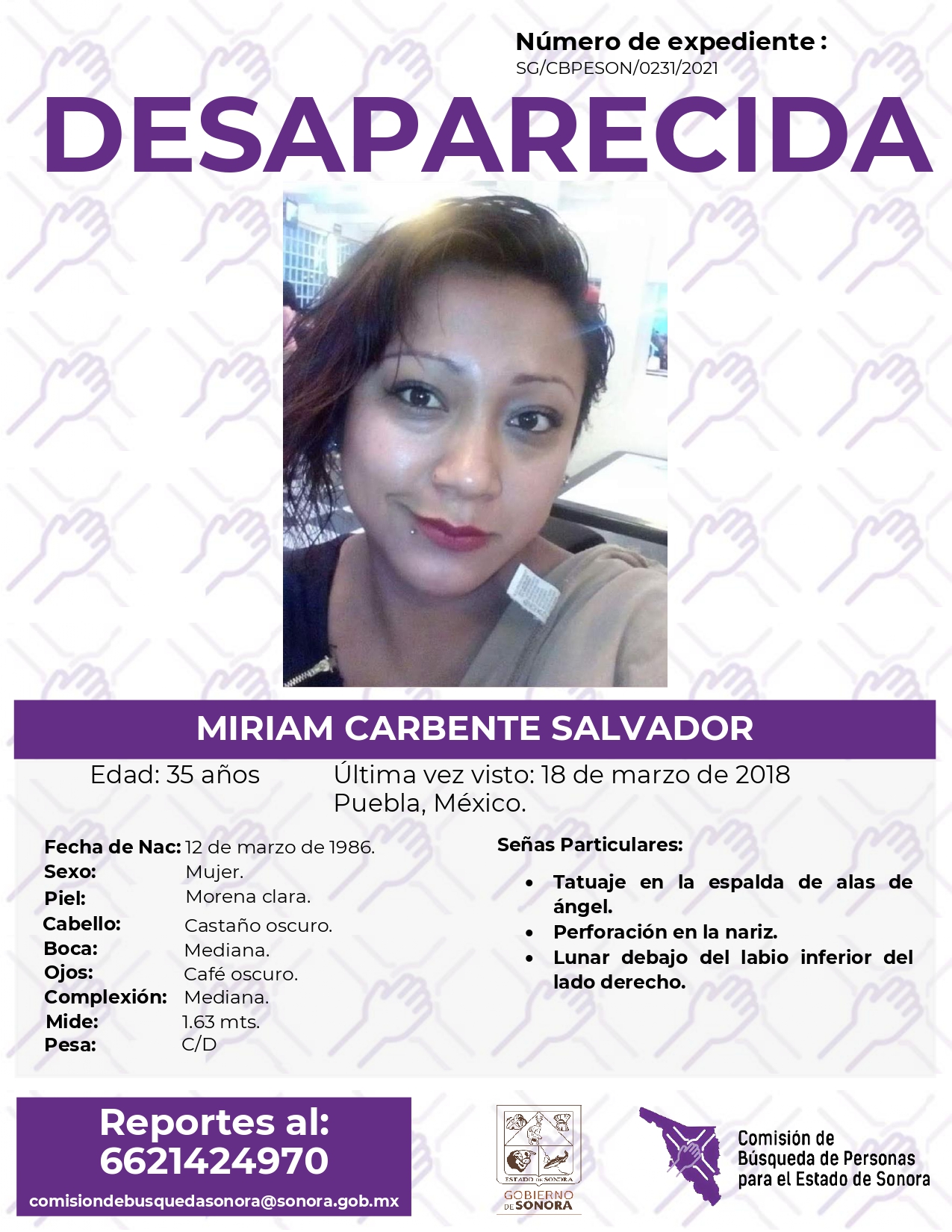 La Comisión de Búsqueda de Personas Para el Estado de Sonora solicita apoyo para localizar a MIRIAM CARBENTE SALVADOR. Cualquier información, al correo y teléfono: Esta dirección de correo electrónico está siendo protegida contra los robots de spam. Necesita tener JavaScript habilitado para poder verlo. -6621424970 *La información será usada de manera anónima* "Toda persona tiene un hogar, ayudémosle a regresar". #desaparecidos #ComisiónDeBúsqueda