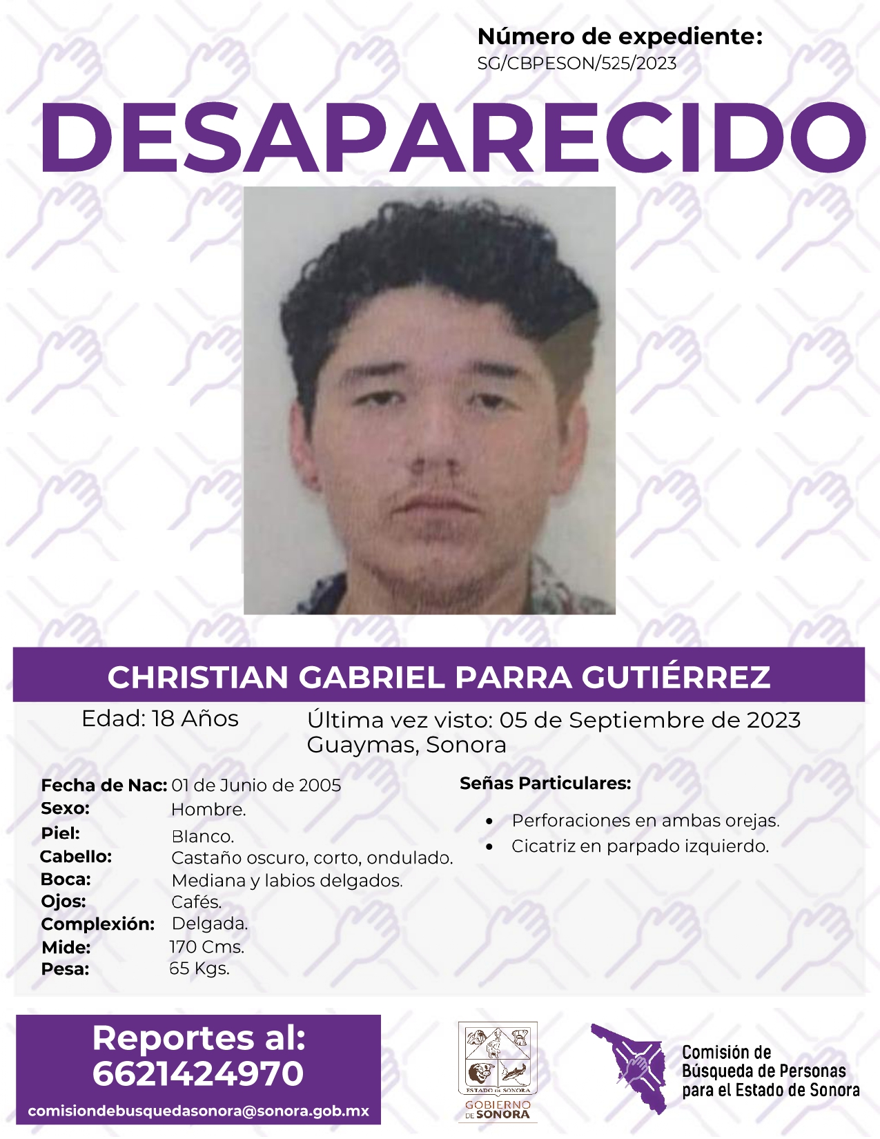 La Comisión de Búsqueda de Personas Para el Estado de Sonora solicita apoyo para localizar a CHRISTIAN GABRIEL PARRA GUTIÉRREZ. Cualquier información, al correo y teléfono: Esta dirección de correo electrónico está siendo protegida contra los robots de spam. Necesita tener JavaScript habilitado para poder verlo. -6621424970 *La información será usada de manera anónima* "Toda persona tiene un hogar, ayudémosle a regresar". #desaparecidos #ComisiónDeBúsqueda