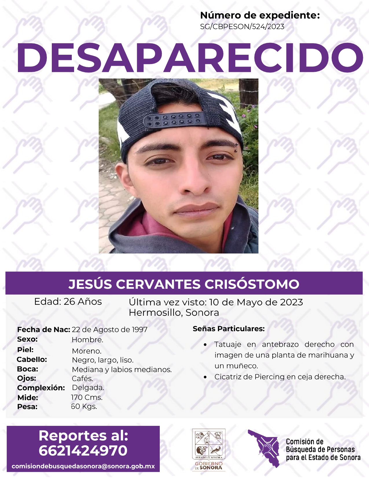 La Comisión de Búsqueda de Personas Para el Estado de Sonora solicita apoyo para localizar a JESÚS CERVANTES CRISÓSTOMO. Cualquier información, al correo y teléfono: Esta dirección de correo electrónico está siendo protegida contra los robots de spam. Necesita tener JavaScript habilitado para poder verlo. -6621424970 *La información será usada de manera anónima* "Toda persona tiene un hogar, ayudémosle a regresar". #desaparecidos #ComisiónDeBúsqueda