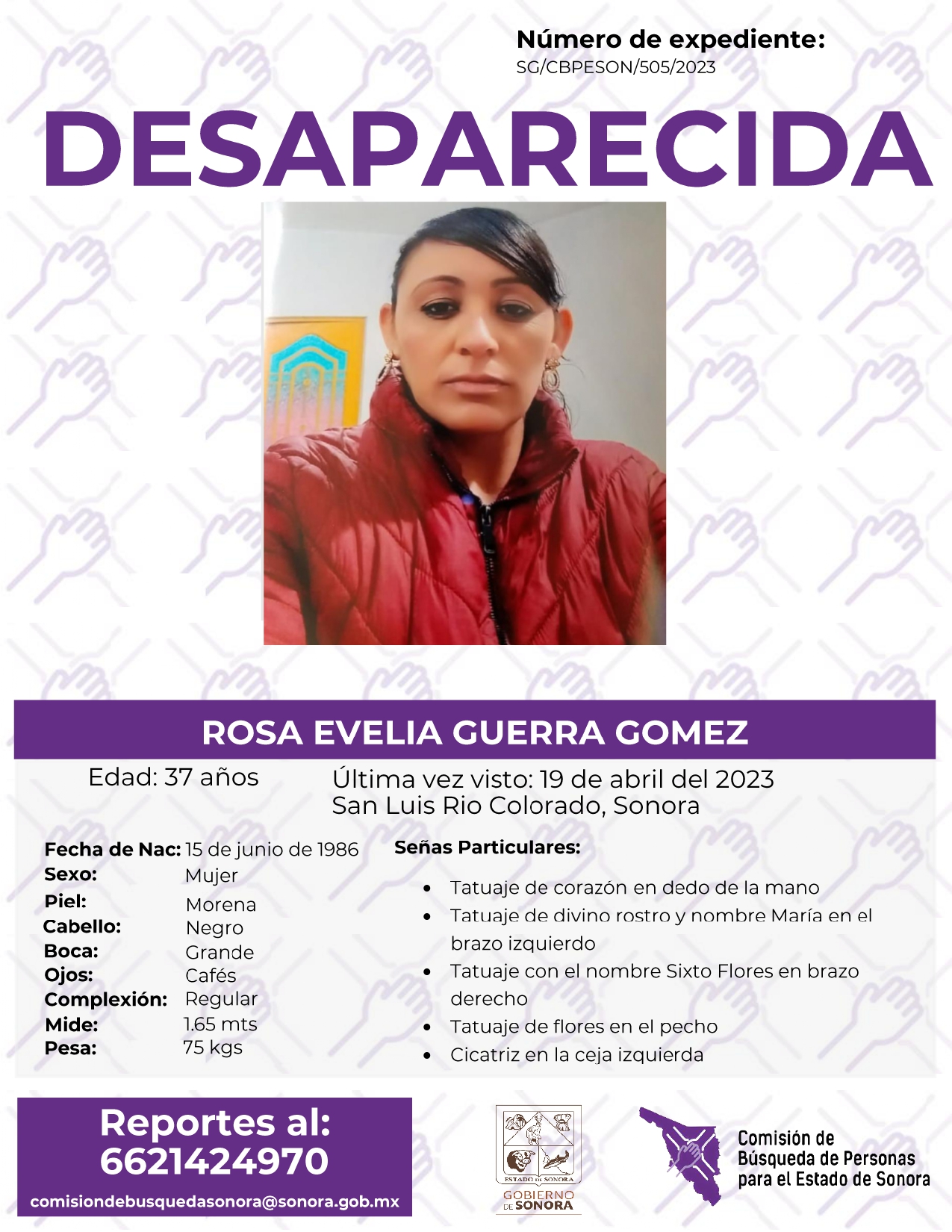 La Comisión de Búsqueda de Personas Para el Estado de Sonora solicita apoyo para localizar a ROSA EVELIA GUERRA GOMEZ. Cualquier información, al correo y teléfono: Esta dirección de correo electrónico está siendo protegida contra los robots de spam. Necesita tener JavaScript habilitado para poder verlo. -6621424970 *La información será usada de manera anónima* "Toda persona tiene un hogar, ayudémosle a regresar". #desaparecidos #ComisiónDeBúsqueda