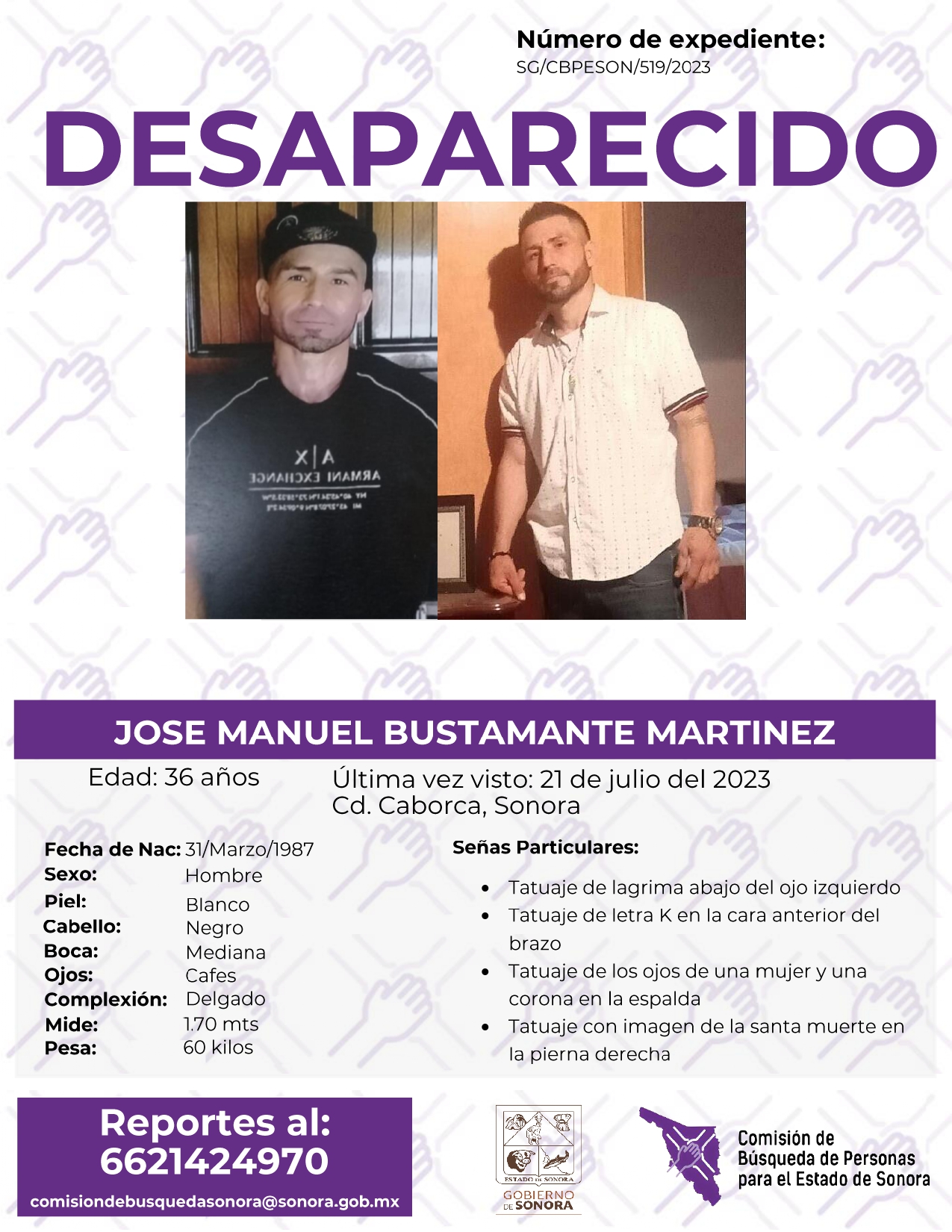 La Comisión de Búsqueda de Personas Para el Estado de Sonora solicita apoyo para localizar a JOSÉ MANUEL BUSTAMANTE MARTÍNEZ. Cualquier información, al correo y teléfono: Esta dirección de correo electrónico está siendo protegida contra los robots de spam. Necesita tener JavaScript habilitado para poder verlo. -6621424970 *La información será usada de manera anónima* "Toda persona tiene un hogar, ayudémosle a regresar". #desaparecidos #ComisiónDeBúsqueda