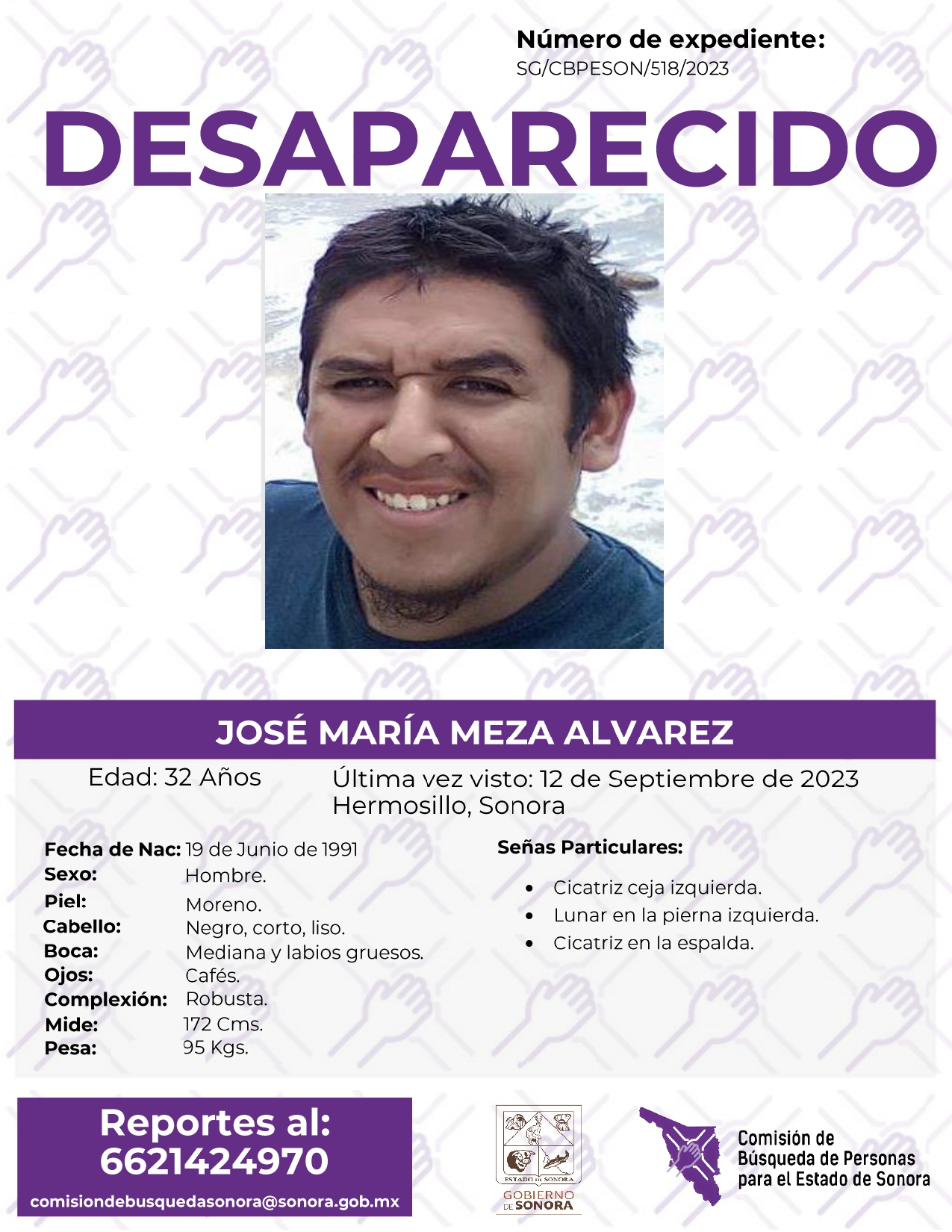 La Comisión de Búsqueda de Personas Para el Estado de Sonora solicita apoyo para localizar a JOSÉ MARÍA MEZA ALVAREZ. Cualquier información, al correo y teléfono: Esta dirección de correo electrónico está siendo protegida contra los robots de spam. Necesita tener JavaScript habilitado para poder verlo. -6621424970 *La información será usada de manera anónima* "Toda persona tiene un hogar, ayudémosle a regresar". #desaparecidos #ComisiónDeBúsqueda