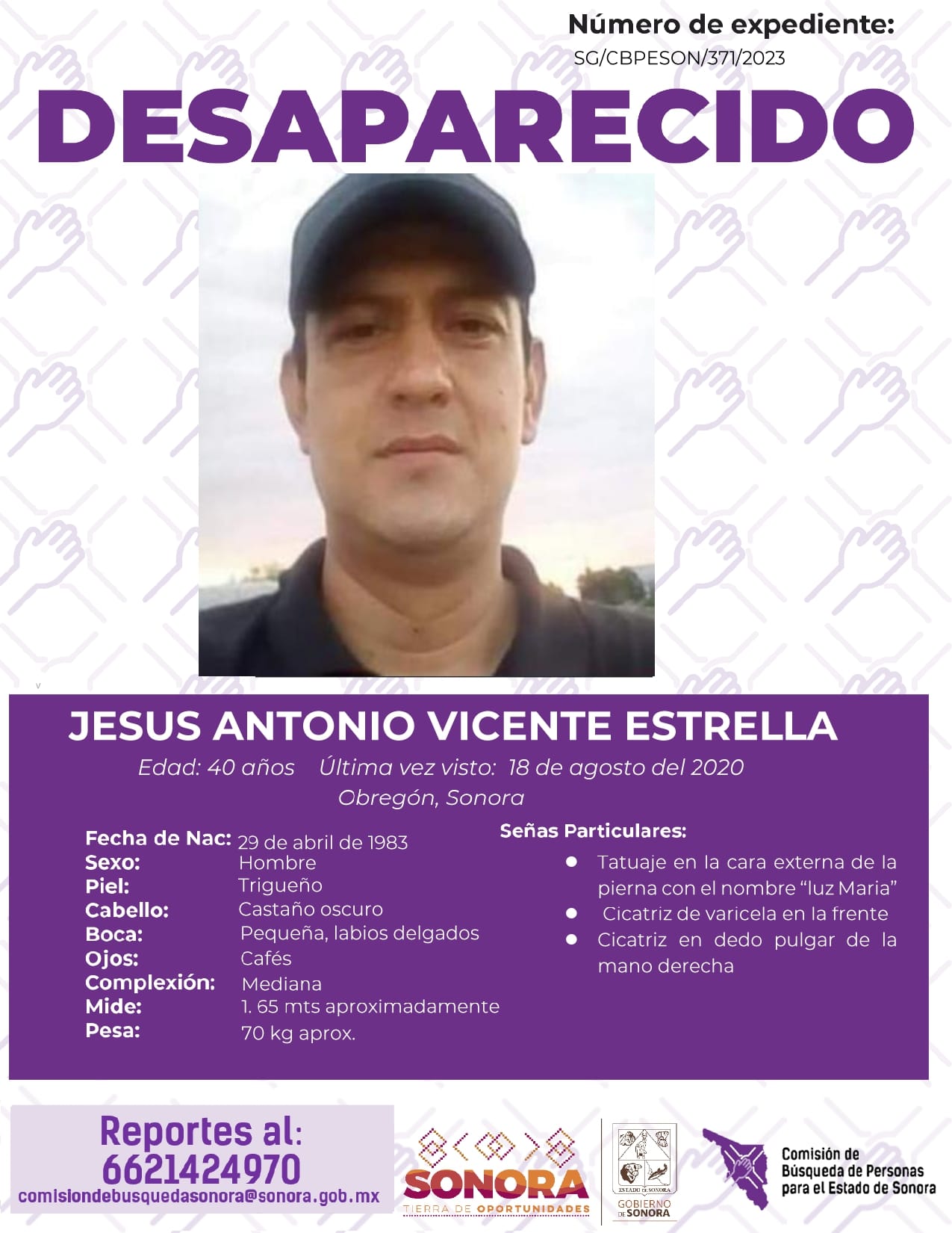La Comisión de Búsqueda de Personas Para el Estado de Sonora solicita apoyo para localizar a JESUS ANTONIO VICENTE ESTRELLA. Cualquier información, al correo y teléfono: Esta dirección de correo electrónico está siendo protegida contra los robots de spam. Necesita tener JavaScript habilitado para poder verlo. -6621424970 *La información será usada de manera anónima* "Toda persona tiene un hogar, ayudémosle a regresar". #desaparecidos #ComisiónDeBúsqueda