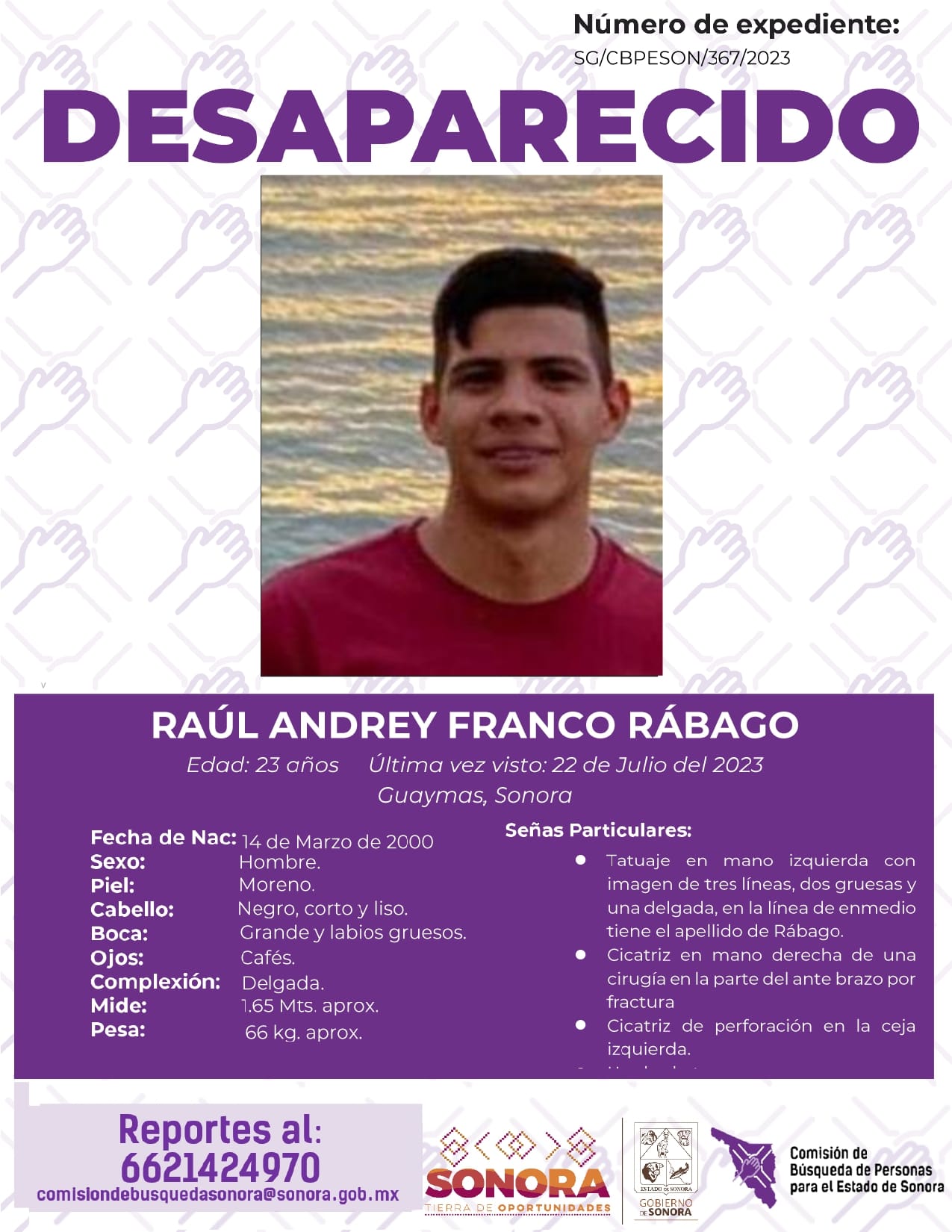 La Comisión de Búsqueda de Personas Para el Estado de Sonora solicita apoyo para localizar a RAÚL ANDREY FRANCO RÁBAGO. Cualquier información, al correo y teléfono: Esta dirección de correo electrónico está siendo protegida contra los robots de spam. Necesita tener JavaScript habilitado para poder verlo. -6621424970 *La información será usada de manera anónima* "Toda persona tiene un hogar, ayudémosle a regresar". #desaparecidos #ComisiónDeBúsqueda