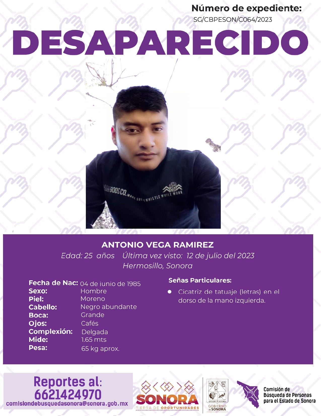 La Comisión de Búsqueda de Personas Para el Estado de Sonora solicita apoyo para localizar a ANTONIO VEGA RAMÍREZ. Cualquier información, al correo y teléfono: Esta dirección de correo electrónico está siendo protegida contra los robots de spam. Necesita tener JavaScript habilitado para poder verlo. -6621424970 *La información será usada de manera anónima* "Toda persona tiene un hogar, ayudémosle a regresar". #desaparecidos #ComisiónDeBúsqueda