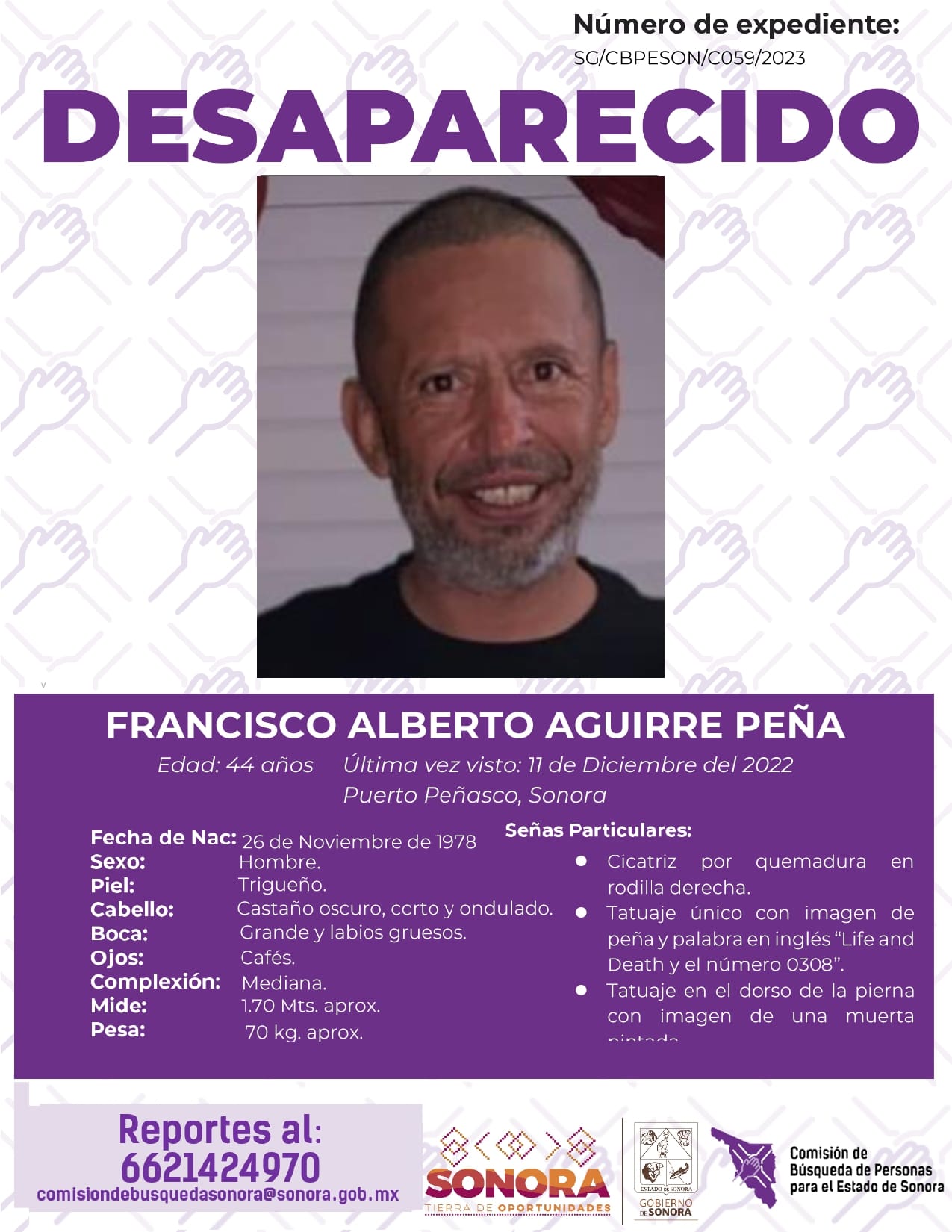 La Comisión de Búsqueda de Personas Para el Estado de Sonora solicita apoyo para localizar a FRANCISCO ALBERTO AGUIRRE PEÑA. Cualquier información, al correo y teléfono: Esta dirección de correo electrónico está siendo protegida contra los robots de spam. Necesita tener JavaScript habilitado para poder verlo. -6621424970 *La información será usada de manera anónima* "Toda persona tiene un hogar, ayudémosle a regresar". #desaparecidos #ComisiónDeBúsqueda