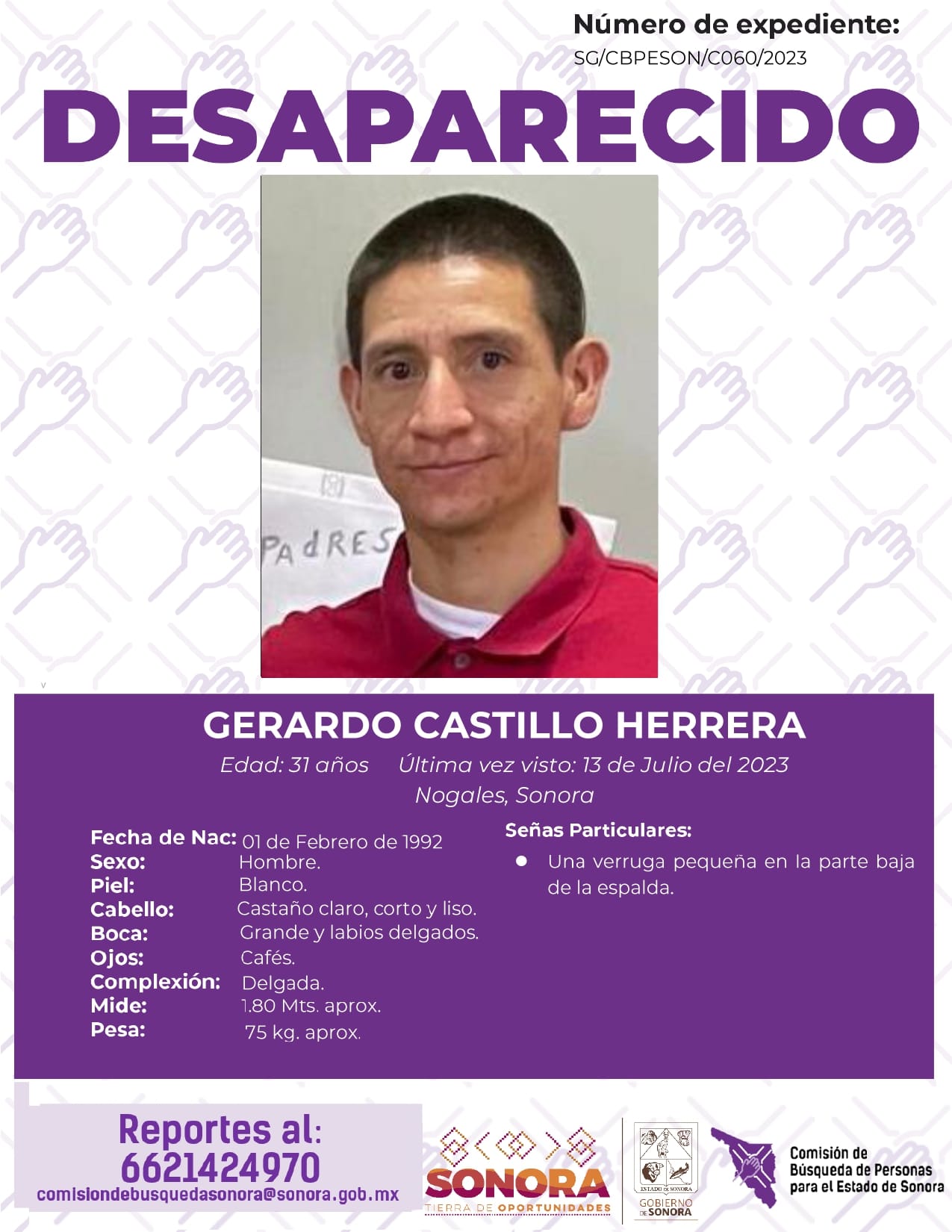La Comisión de Búsqueda de Personas Para el Estado de Sonora solicita apoyo para localizar a GERARDO CASTILLO HERRERA. Cualquier información, al correo y teléfono: Esta dirección de correo electrónico está siendo protegida contra los robots de spam. Necesita tener JavaScript habilitado para poder verlo. -6621424970 *La información será usada de manera anónima* "Toda persona tiene un hogar, ayudémosle a regresar". #desaparecidos #ComisiónDeBúsqueda