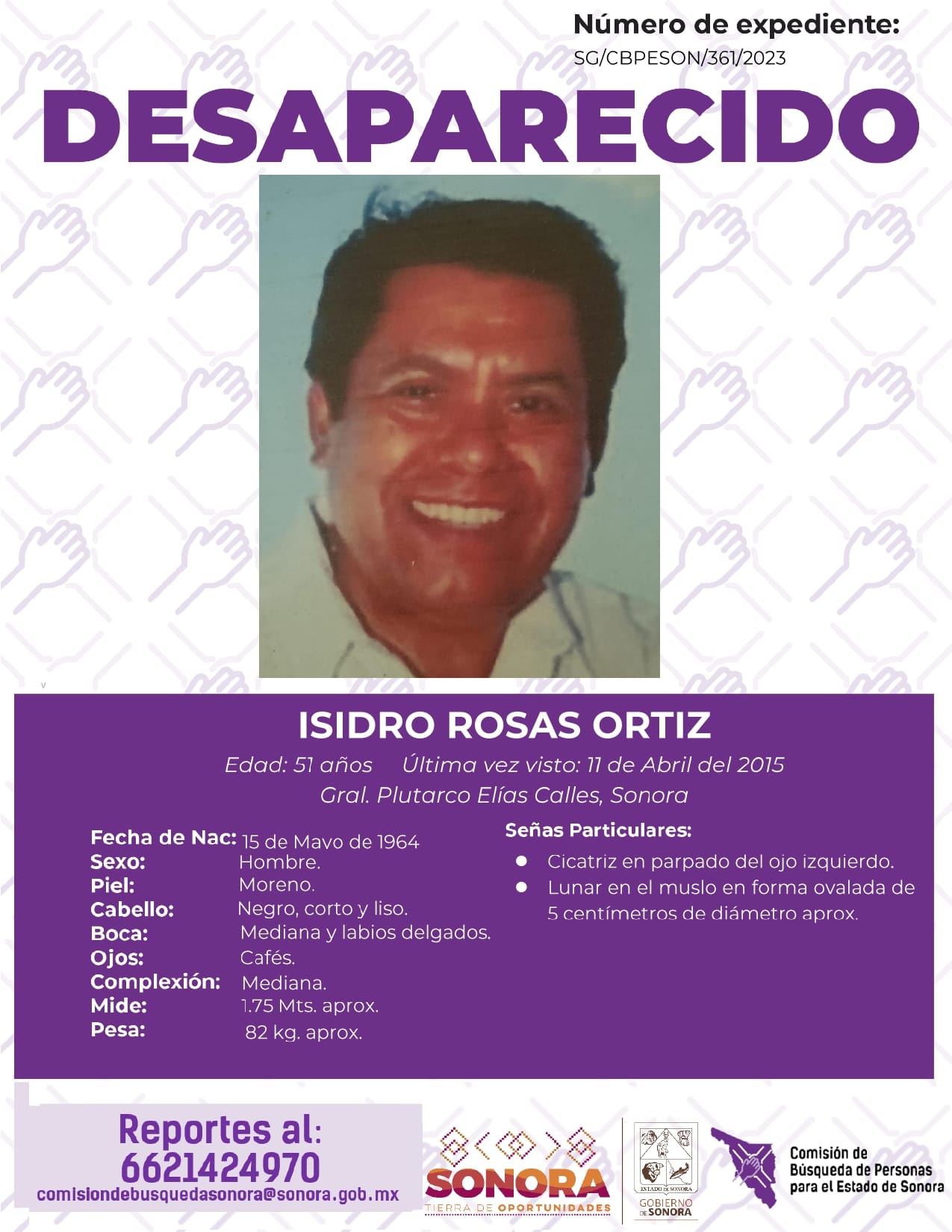 La Comisión de Búsqueda de Personas Para el Estado de Sonora solicita apoyo para localizar a ISIDRO ROSAS ORTÍZ. Cualquier información, al correo y teléfono: Esta dirección de correo electrónico está siendo protegida contra los robots de spam. Necesita tener JavaScript habilitado para poder verlo. -6621424970 *La información será usada de manera anónima* "Toda persona tiene un hogar, ayudémosle a regresar". #desaparecidos #ComisiónDeBúsqueda
