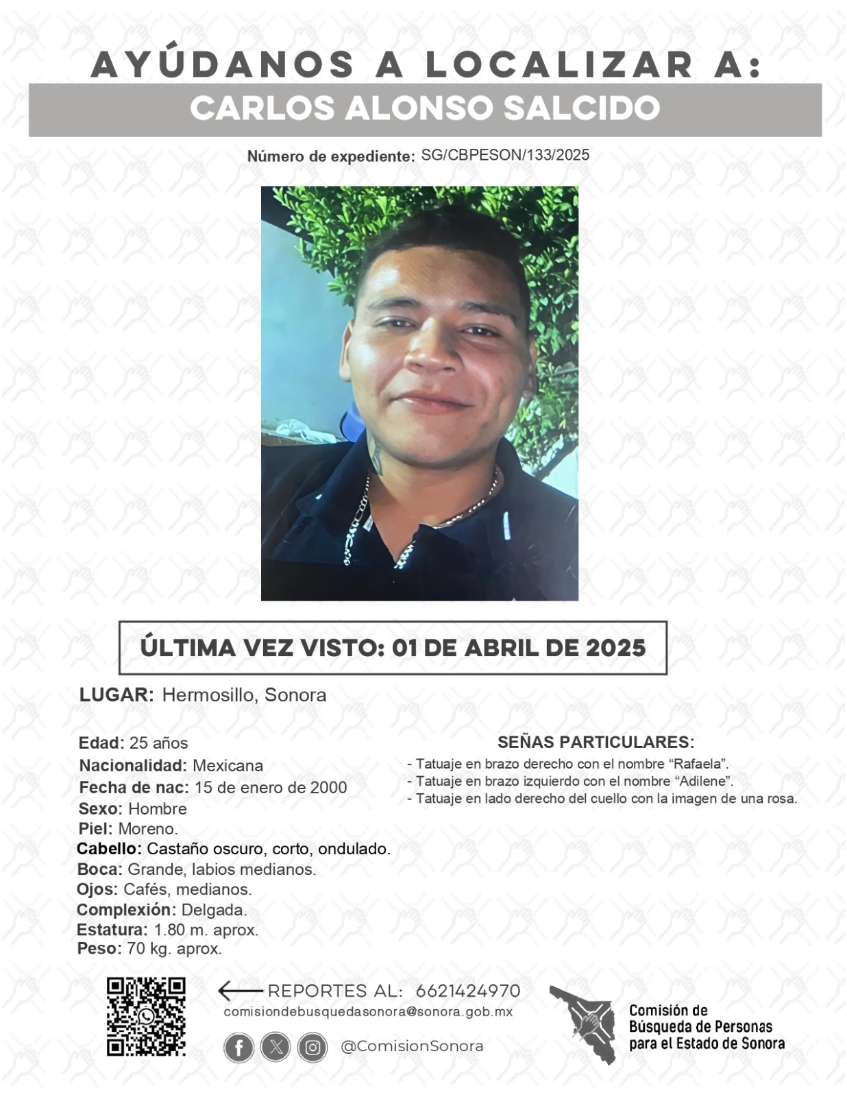 La Comisión de Búsqueda Para el Estado de Sonora solicita apoyo para localizar a CARLOS ALONSO SALCIDO.