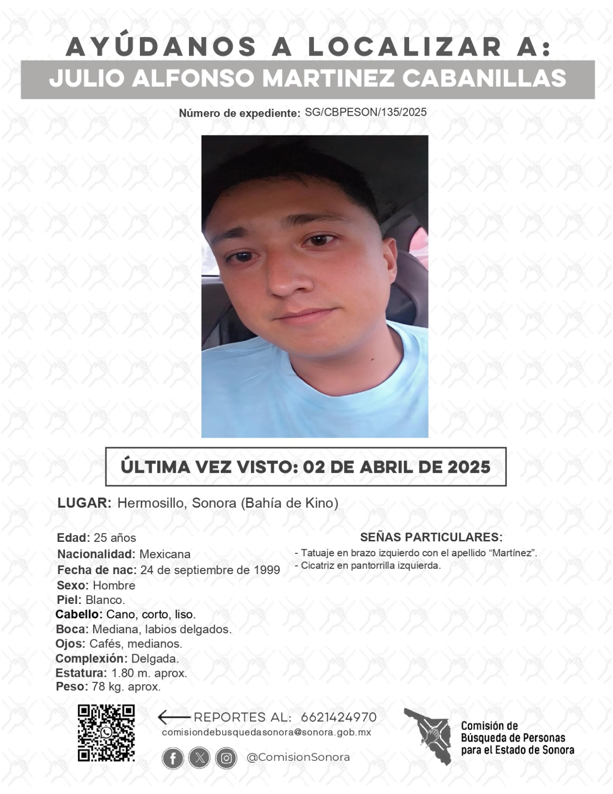 La Comisión de Búsqueda Para el Estado de Sonora solicita apoyo para localizar a JULIO ALFONSO MARTINEZ CABANILLAS.