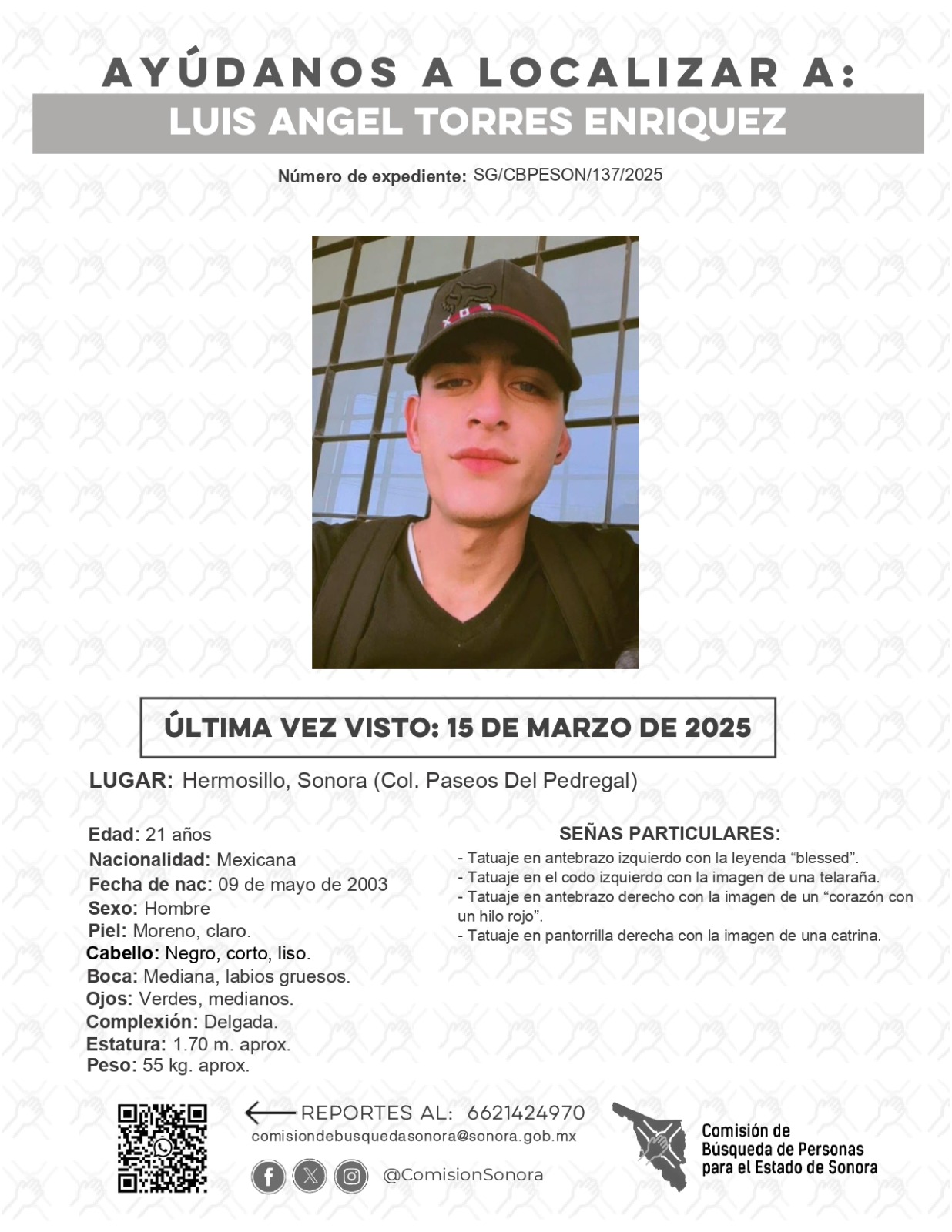 La Comisión de Búsqueda Para el Estado de Sonora solicita apoyo para localizar a LUIS ANGEL TORRES ENRIQUEZ.
