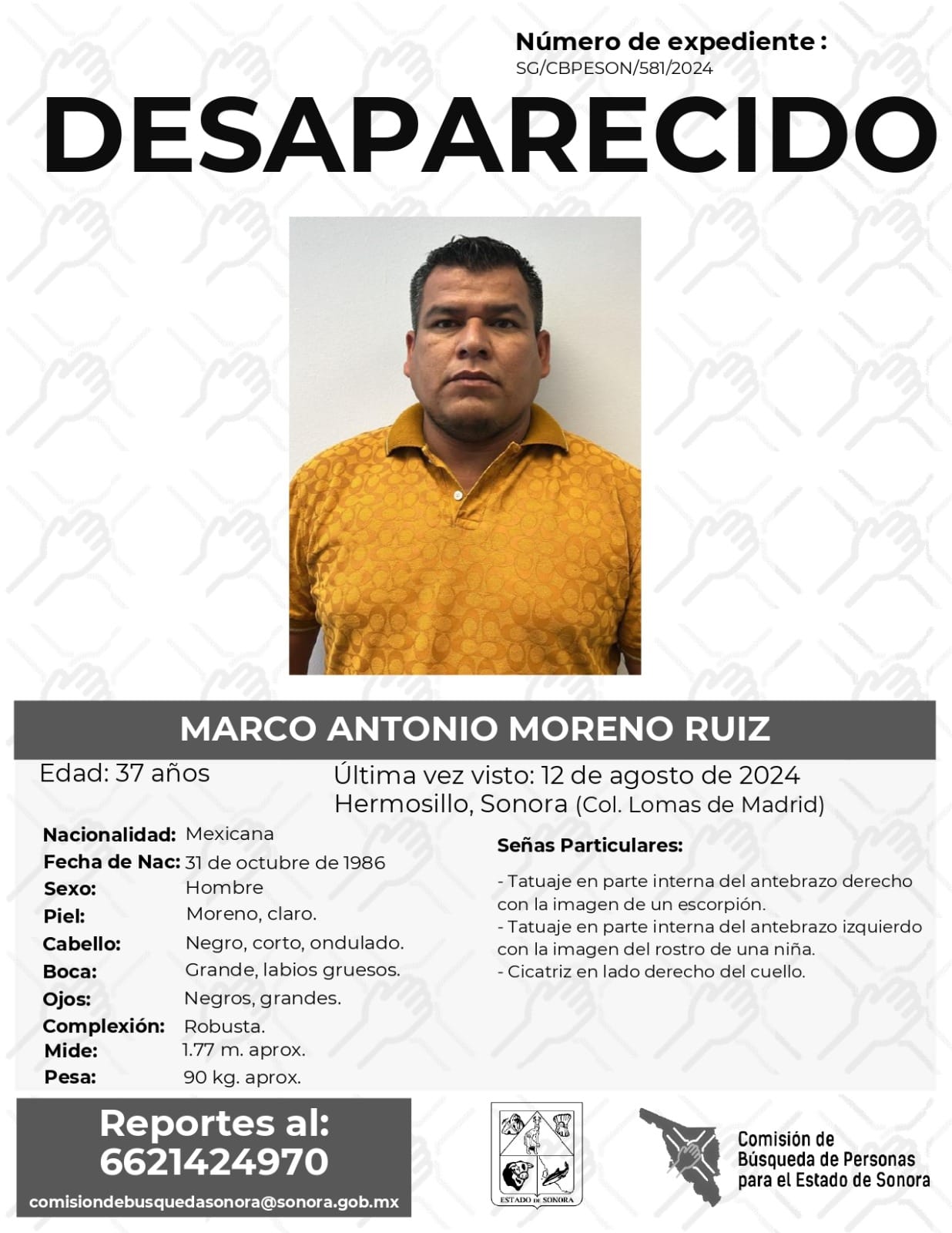 La Comisión de Búsqueda Para el Estado de Sonora solicita apoyo para localizar a MARCO ANTONIO MORENO RUIZ. Cualquier información, al correo y teléfono: Esta dirección de correo electrónico está siendo protegida contra los robots de spam. Necesita tener JavaScript habilitado para poder verlo. -6621424970 *La información será usada de manera anónima* “Toda persona tiene un hogar, ayudémosle a regresar”. #desaparecidos #ComisiónDeBúsqueda #Sonora#Hermosillo