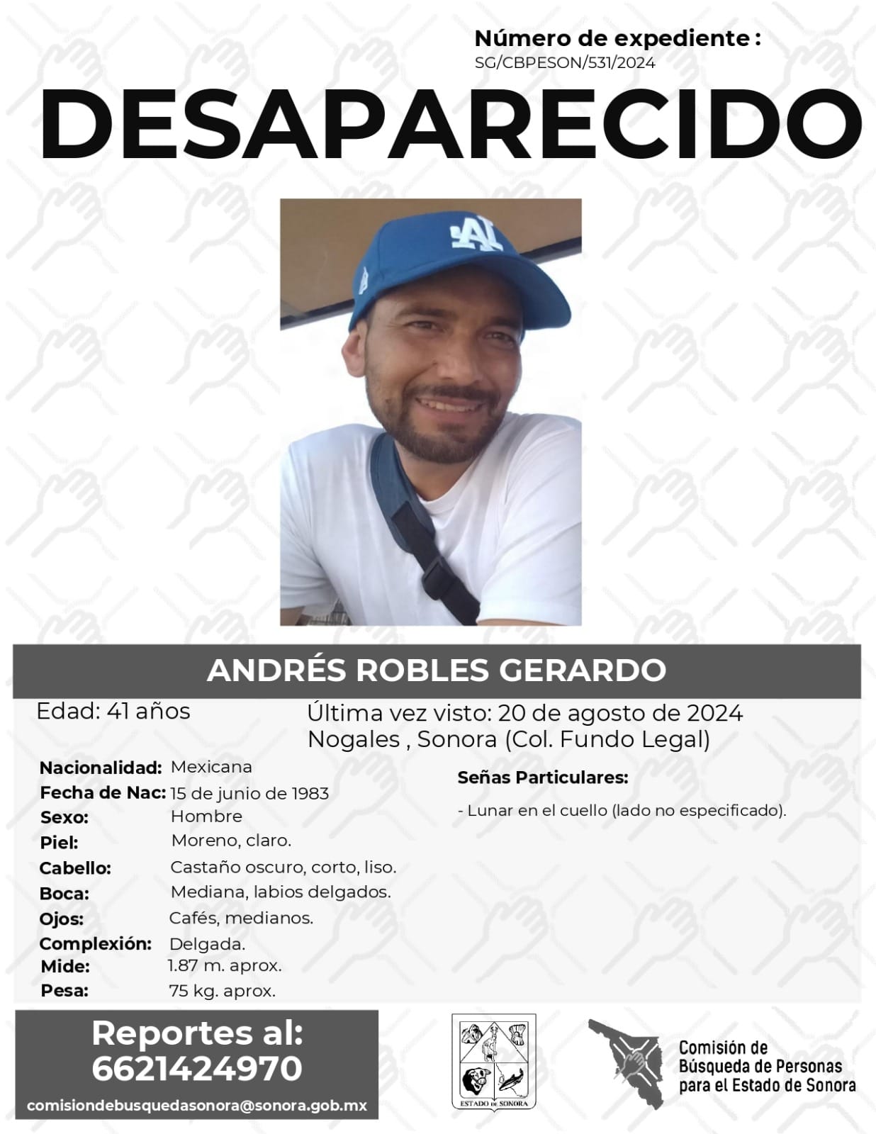 La Comisión de Búsqueda Para el Estado de Sonora solicita apoyo para localizar a ANDRÉS ROBLES GERARDO. Cualquier información, al correo y teléfono: Esta dirección de correo electrónico está siendo protegida contra los robots de spam. Necesita tener JavaScript habilitado para poder verlo. -6621424970 *La información será usada de manera anónima* “Toda persona tiene un hogar, ayudémosle a regresar”. #desaparecidos #ComisiónDeBúsqueda #Sonora#Nogales