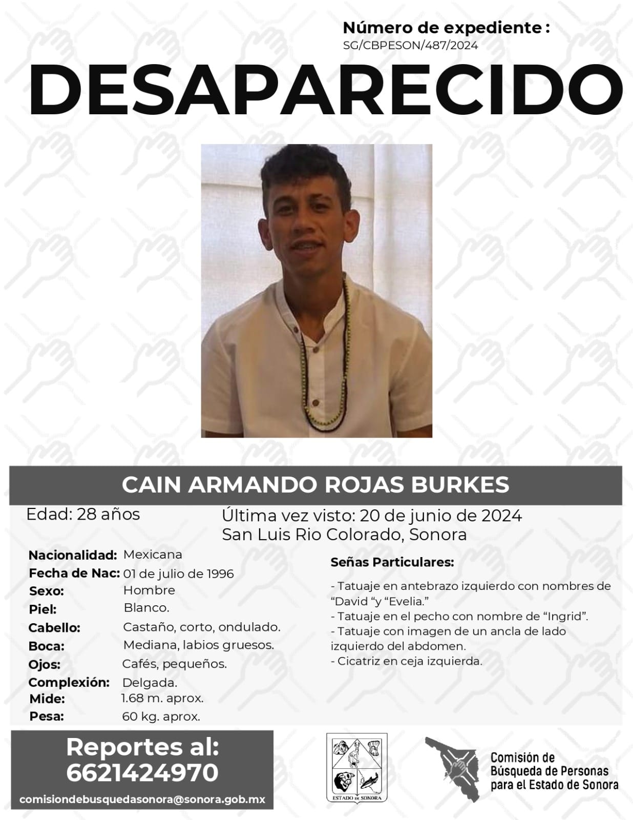 La Comisión de Búsqueda Para el Estado de Sonora solicita apoyo para localizar a CAIN ARMANDO ROJAS BURKES. Cualquier información, al correo y teléfono: Esta dirección de correo electrónico está siendo protegida contra los robots de spam. Necesita tener JavaScript habilitado para poder verlo. -6621424970 *La información será usada de manera anónima* “Toda persona tiene un hogar, ayudémosle a regresar”. #desaparecidos #ComisiónDeBúsqueda #Sonora#SanLuisRioColorado