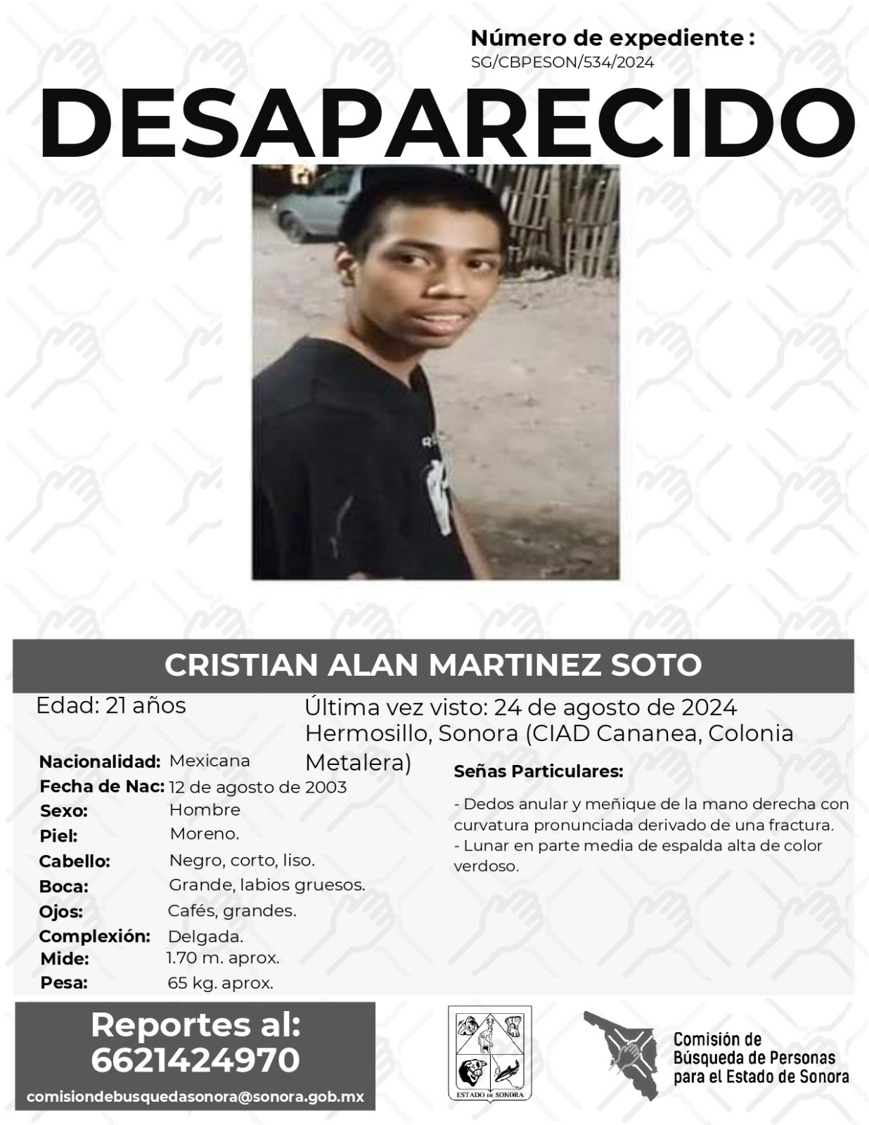 La Comisión de Búsqueda Para el Estado de Sonora solicita apoyo para localizar a CRISTIAN ALAN MARTÍNEZ SOTO. Cualquier información, al correo y teléfono: Esta dirección de correo electrónico está siendo protegida contra los robots de spam. Necesita tener JavaScript habilitado para poder verlo. -6621424970 *La información será usada de manera anónima* “Toda persona tiene un hogar, ayudémosle a regresar”. #desaparecidos #ComisiónDeBúsqueda #Sonora#Hermosillo