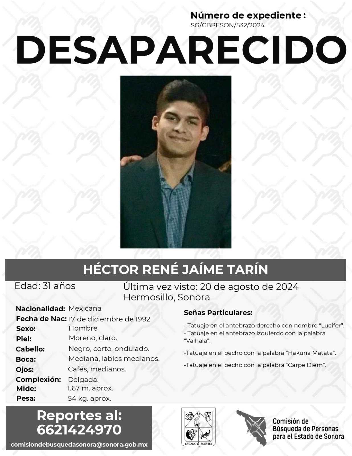 La Comisión de Búsqueda Para el Estado de Sonora solicita apoyo para localizar a HÉCTOR RENÉ JAIME TARÍN. Cualquier información, al correo y teléfono: Esta dirección de correo electrónico está siendo protegida contra los robots de spam. Necesita tener JavaScript habilitado para poder verlo. -6621424970 *La información será usada de manera anónima* “Toda persona tiene un hogar, ayudémosle a regresar”. #desaparecidos #ComisiónDeBúsqueda #Sonora#Hermosillo