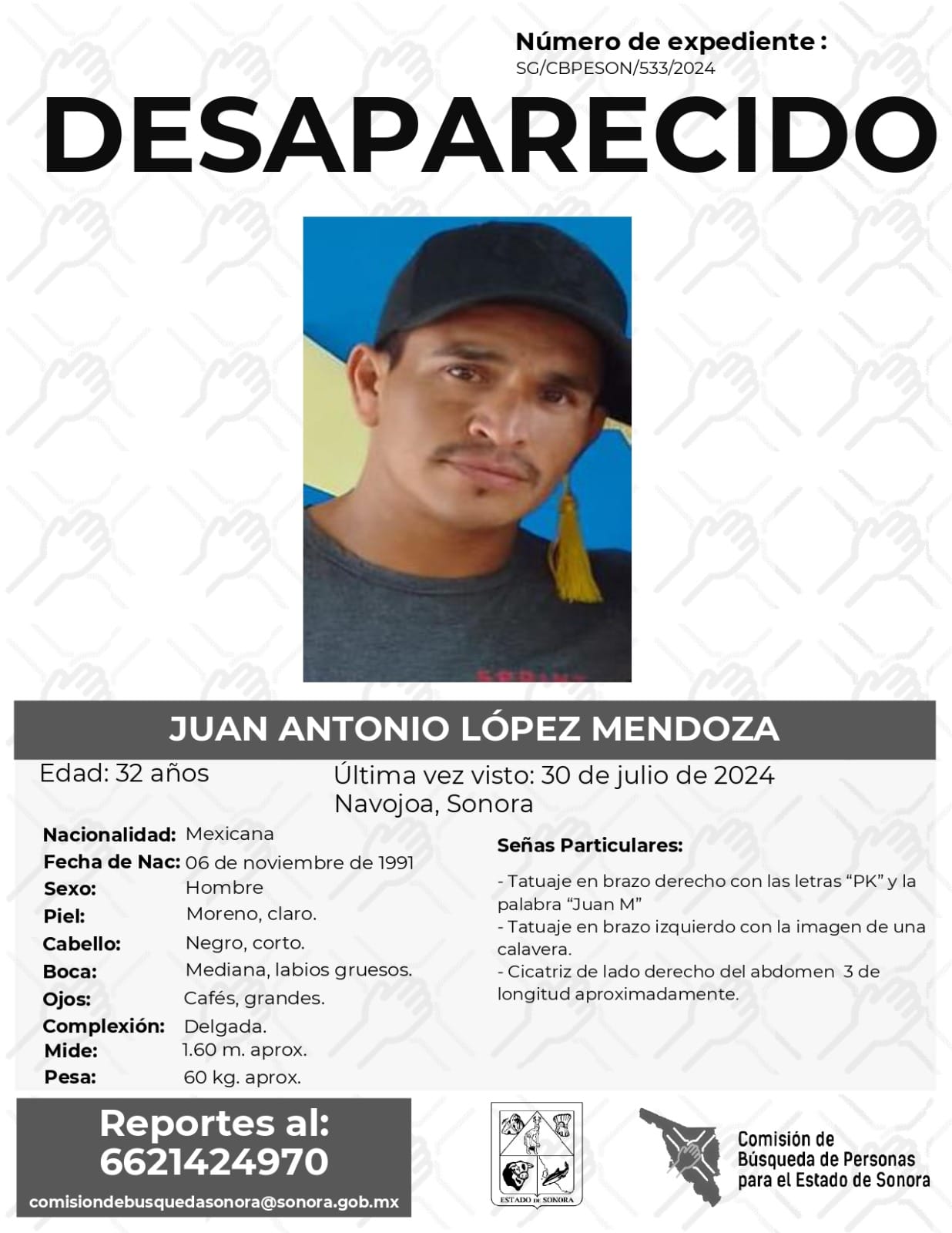 La Comisión de Búsqueda Para el Estado de Sonora solicita apoyo para localizar a JUAN ANTONIO LÓPEZ MENDOZA. Cualquier información, al correo y teléfono: Esta dirección de correo electrónico está siendo protegida contra los robots de spam. Necesita tener JavaScript habilitado para poder verlo. -6621424970 *La información será usada de manera anónima* “Toda persona tiene un hogar, ayudémosle a regresar”. #desaparecidos #ComisiónDeBúsqueda #Sonora#Navojoa