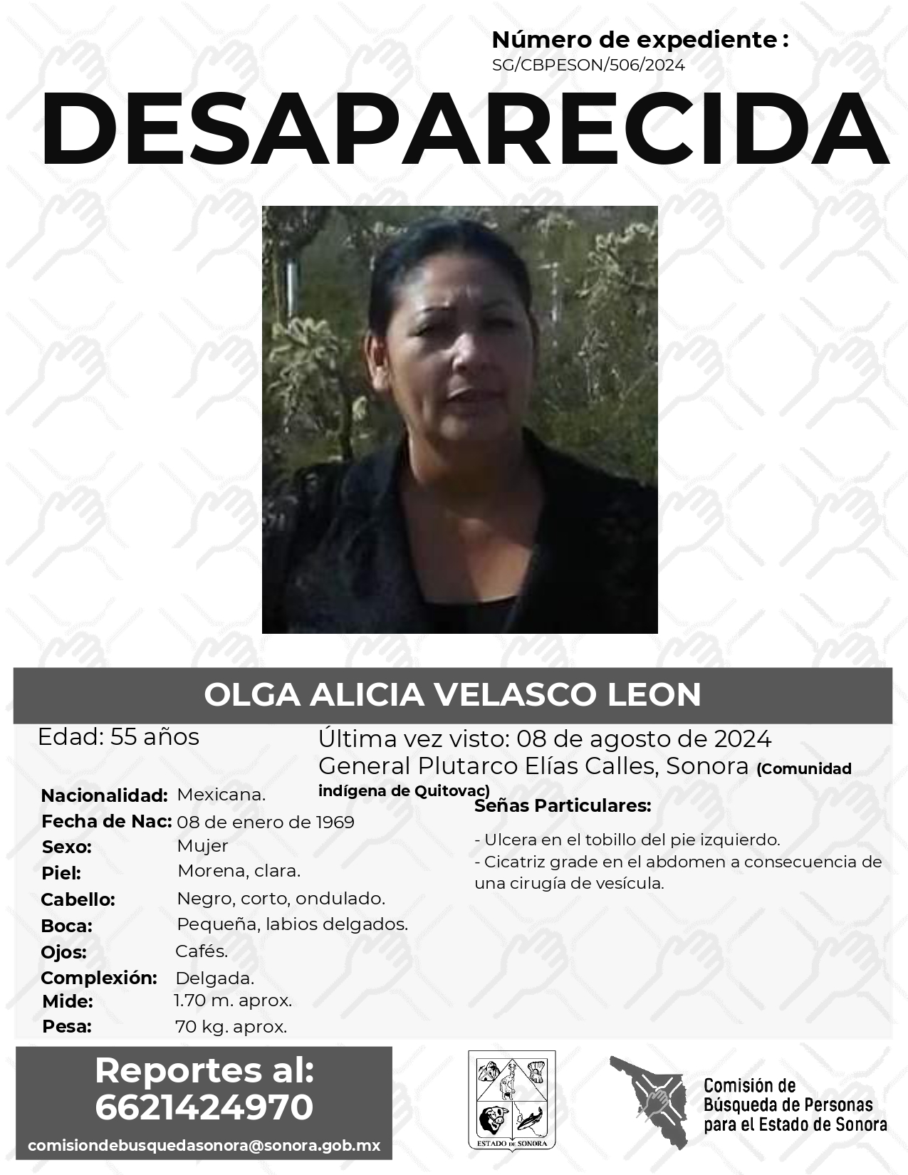 La Comisión de Búsqueda Para el Estado de Sonora solicita apoyo para localizar a OLGA ALICIA VELASCO LEON. Cualquier información, al correo y teléfono: Esta dirección de correo electrónico está siendo protegida contra los robots de spam. Necesita tener JavaScript habilitado para poder verlo. -6621424970 *La información será usada de manera anónima* “Toda persona tiene un hogar, ayudémosle a regresar”. #desaparecidos #ComisiónDeBúsqueda #Sonora#GeneralPlutarcoEliasCalles