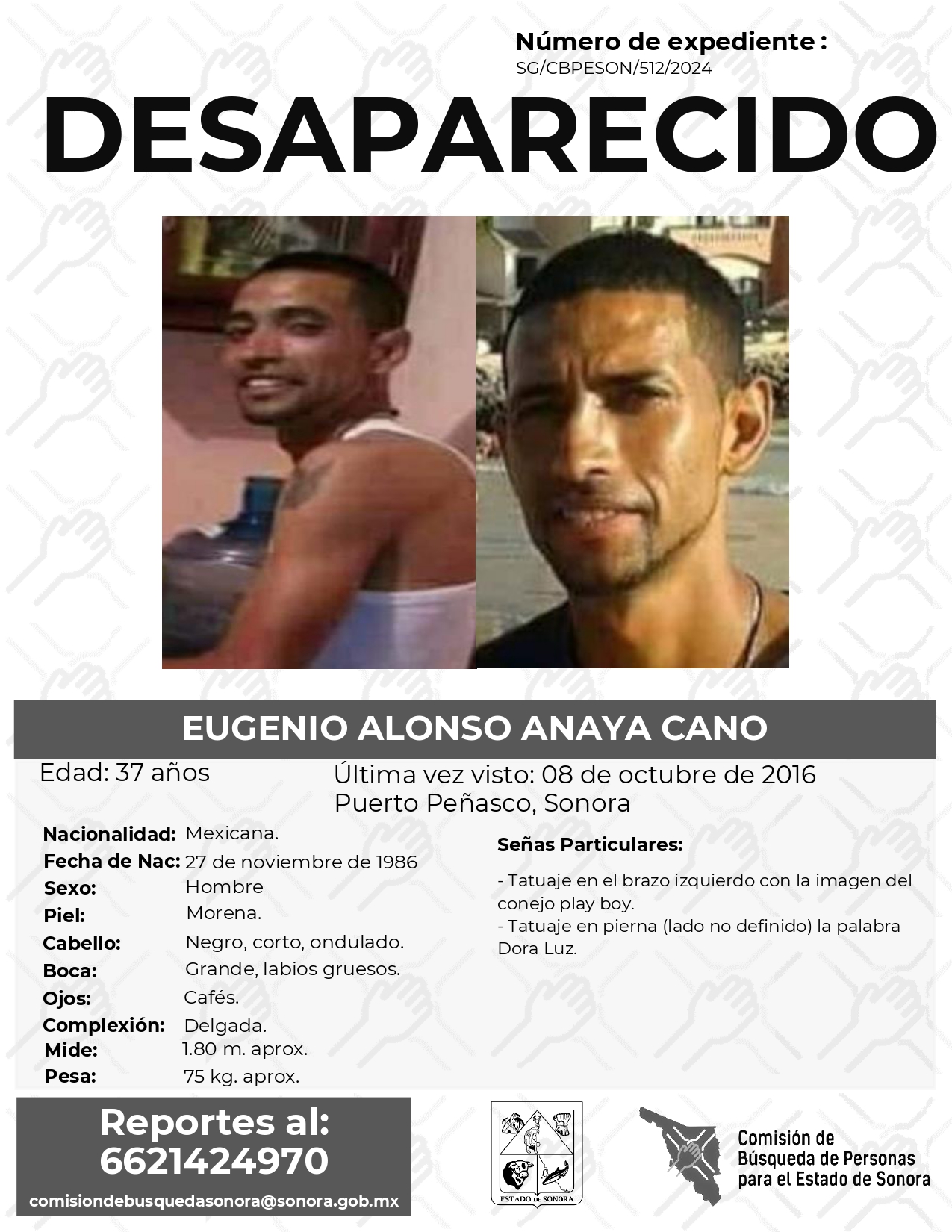 La Comisión de Búsqueda Para el Estado de Sonora solicita apoyo para localizar a EUGENIO ALONSO ANAYA CANO. Cualquier información, al correo y teléfono: Esta dirección de correo electrónico está siendo protegida contra los robots de spam. Necesita tener JavaScript habilitado para poder verlo. -6621424970 *La información será usada de manera anónima* "Toda persona tiene un hogar, ayudémosle a regresar". #Desaparecidos #ComisiónDeBúsqueda #Sonora#PuertoPeñasco