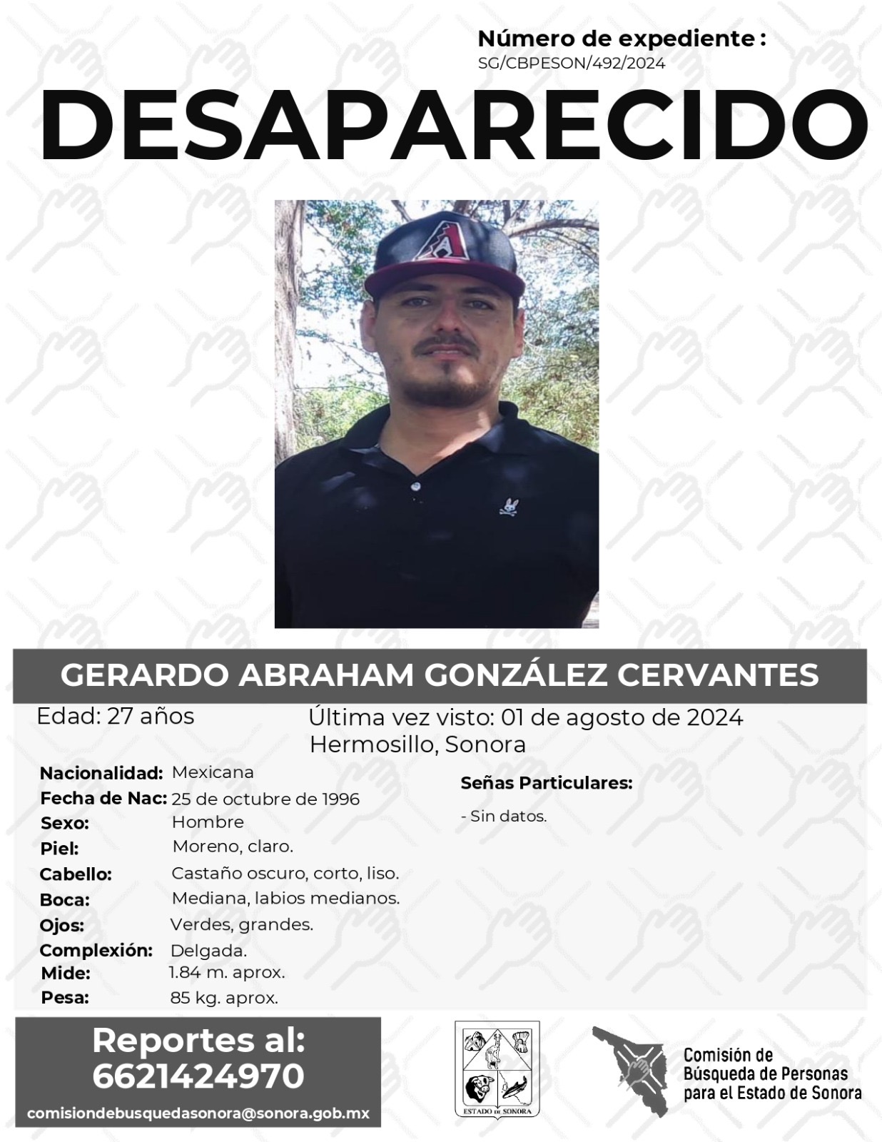La Comisión de Búsqueda Para el Estado de Sonora solicita apoyo para localizar a GERARDO ABRAHAM GONZÁLEZ CERVANTES. Cualquier información, al correo y teléfono: Esta dirección de correo electrónico está siendo protegida contra los robots de spam. Necesita tener JavaScript habilitado para poder verlo. -6621424970 *La información será usada de manera anónima* “Toda persona tiene un hogar, ayudémosle a regresar”. #desaparecidos #ComisiónDeBúsqueda #Sonora#Hermosillo