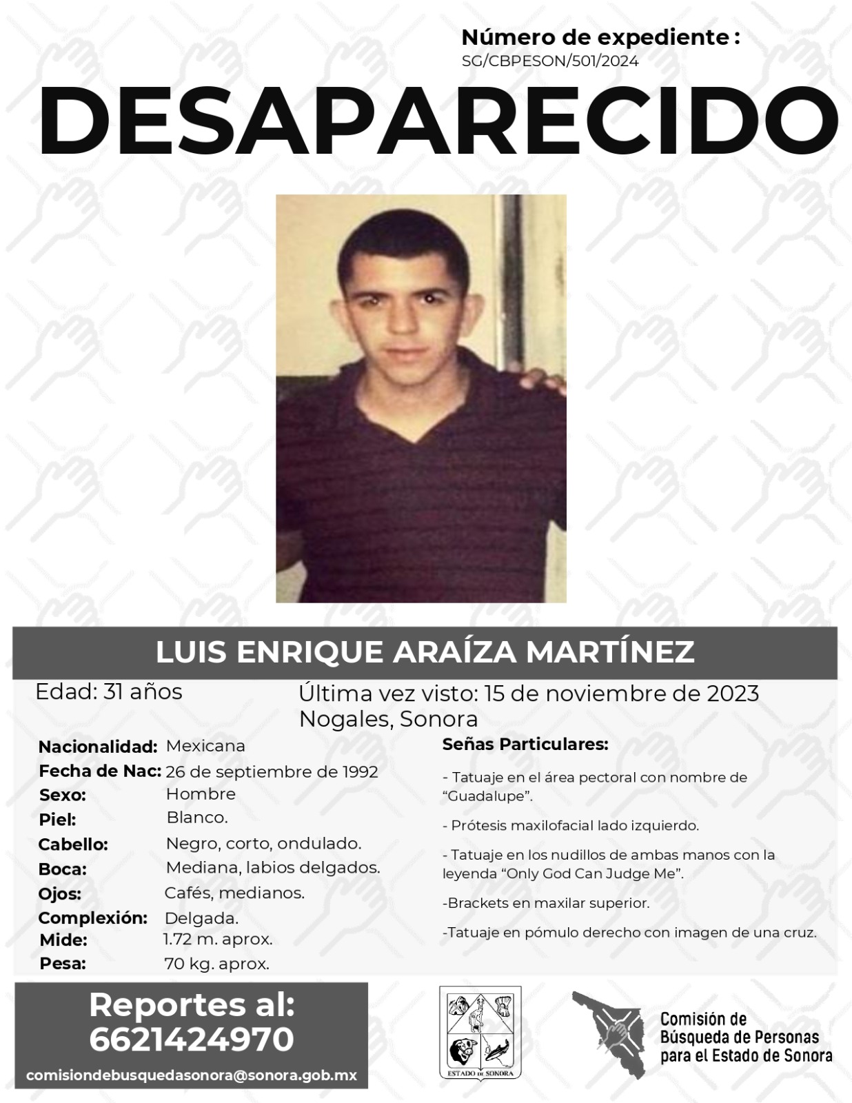 La Comisión de Búsqueda Para el Estado de Sonora solicita apoyo para localizar a LUIS ENRIQUE ARAIZA MARTINEZ. Cualquier información, al correo y teléfono: Esta dirección de correo electrónico está siendo protegida contra los robots de spam. Necesita tener JavaScript habilitado para poder verlo. -6621424970 *La información será usada de manera anónima* “Toda persona tiene un hogar, ayudémosle a regresar”. #desaparecidos #ComisiónDeBúsqueda #Sonora#Nogales
