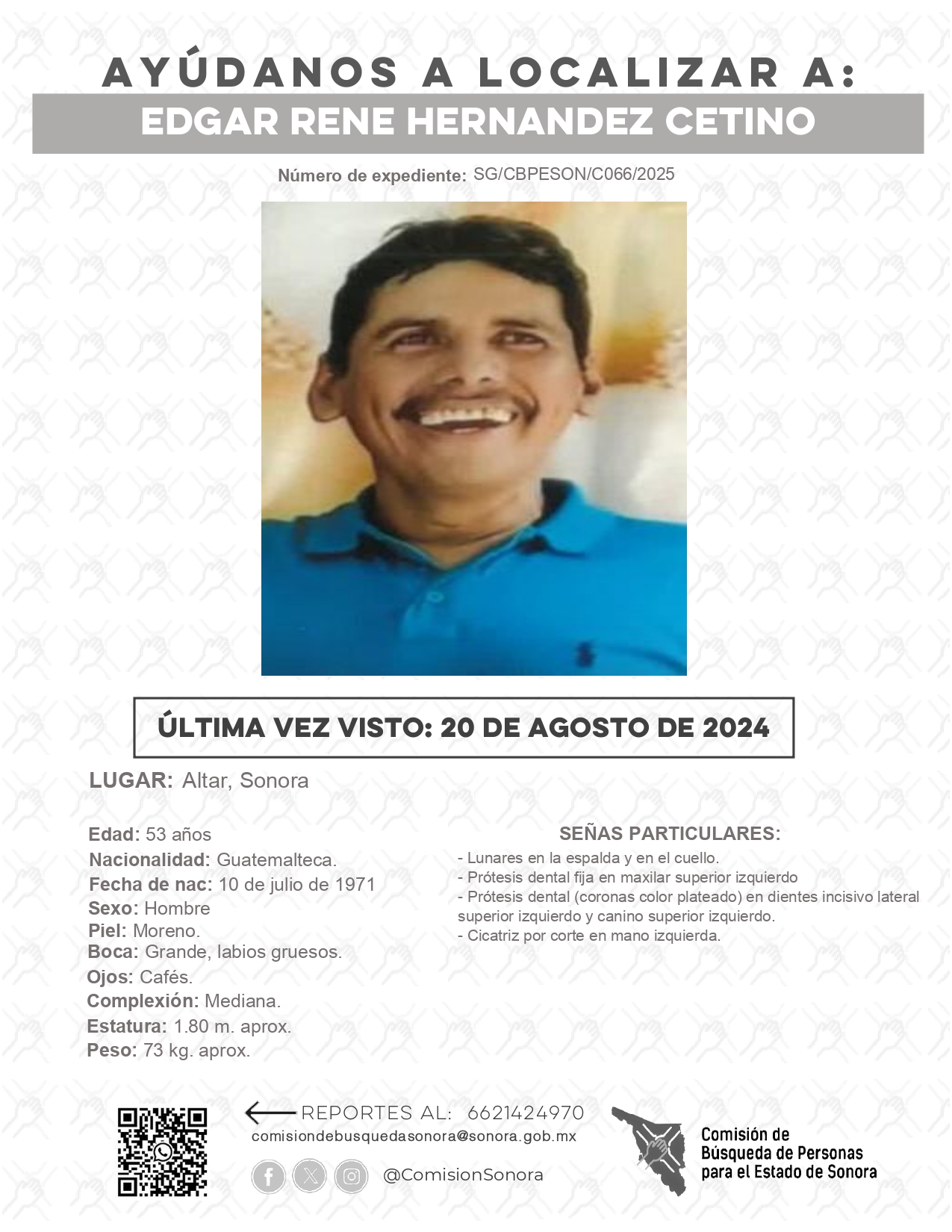 La Comisión de Búsqueda Para el Estado de Sonora solicita apoyo para localizar a EDGAR RENE HERNANDEZ CETINO. Cualquier información, al correo y teléfono: - Esta dirección de correo electrónico está siendo protegida contra los robots de spam. Necesita tener JavaScript habilitado para poder verlo. - 6621424970 La información será usada de manera anónima “Toda persona tiene un hogar, ayudémosle a regresar”. #desaparecidos #ComisiónDeBúsqueda #Sonora #Altar
