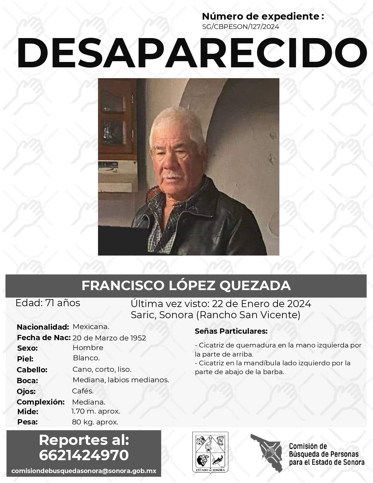 La Comisión de Búsqueda de Personas Para el Estado de Sonora solicita apoyo para localizar a FRANCISCO LÓPEZ QUEZADA. Cualquier información, al correo y teléfono: Esta dirección de correo electrónico está siendo protegida contra los robots de spam. Necesita tener JavaScript habilitado para poder verlo. -6621424970 *La información será usada de manera anónima* "Toda persona tiene un hogar, ayudémosle a regresar". #Desaparecidos #Sonora#Saric #RanchoSanVicente