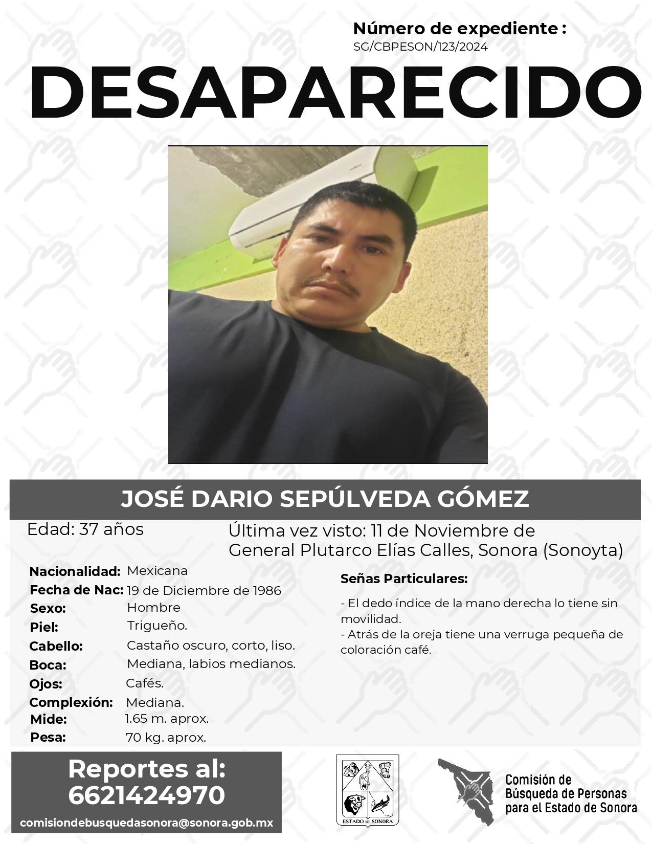 La Comisión de Búsqueda de Personas Para el Estado de Sonora solicita apoyo para localizar a JOSÉ DARIO SEPÚLVEDA GÓMEZ. Cualquier información, al correo y teléfono: Esta dirección de correo electrónico está siendo protegida contra los robots de spam. Necesita tener JavaScript habilitado para poder verlo. -6621424970 *La información será usada de manera anónima* "Toda persona tiene un hogar, ayudémosle a regresar". #Desaparecidos #Sonora#GeneralPlutarcoEliasCalles #Sonoyta