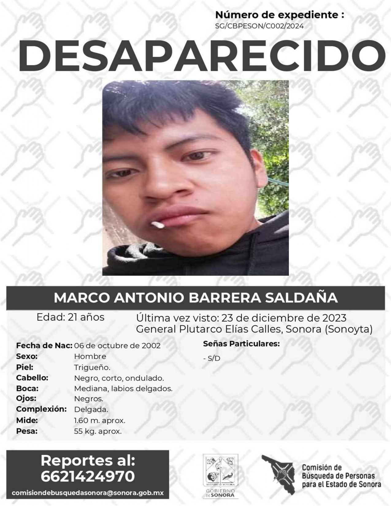 La Comisión de Búsqueda de Personas Para el Estado de Sonora solicita apoyo para localizar a MARCO ANTONIO BARRERA SALDAÑA. Cualquier información, al correo y teléfono: Esta dirección de correo electrónico está siendo protegida contra los robots de spam. Necesita tener JavaScript habilitado para poder verlo. -6621424970 *La información será usada de manera anónima* "Toda persona tiene un hogar, ayudémosle a regresar". #Desaparecidos #Sonora#GeneralPlutarcoEliasCalles #Sonoyta