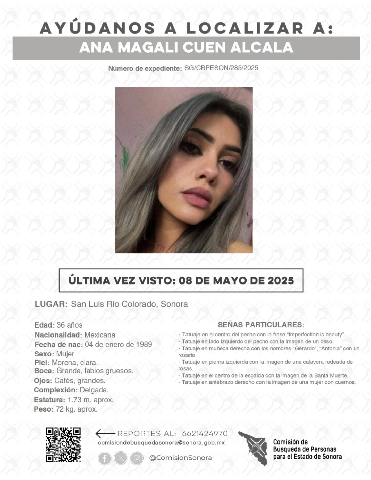 La Comisión de Búsqueda Para el Estado de Sonora solicita apoyo para localizar a ANA MAGALI CUEN ALCALA.