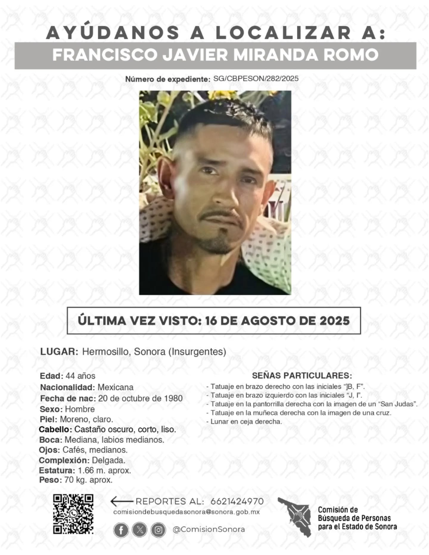 La Comisión de Búsqueda Para el Estado de Sonora solicita apoyo para localizar a FRANCISCO JAVIER MIRANDA ROMO.