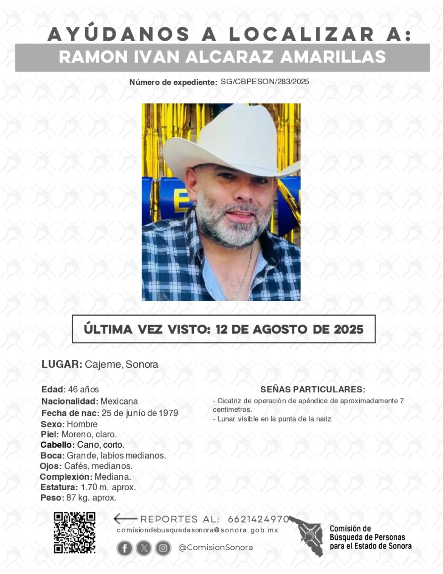 La Comisión de Búsqueda Para el Estado de Sonora solicita apoyo para localizar a RAMON IVAN ALCARAZ AMARILLAS.