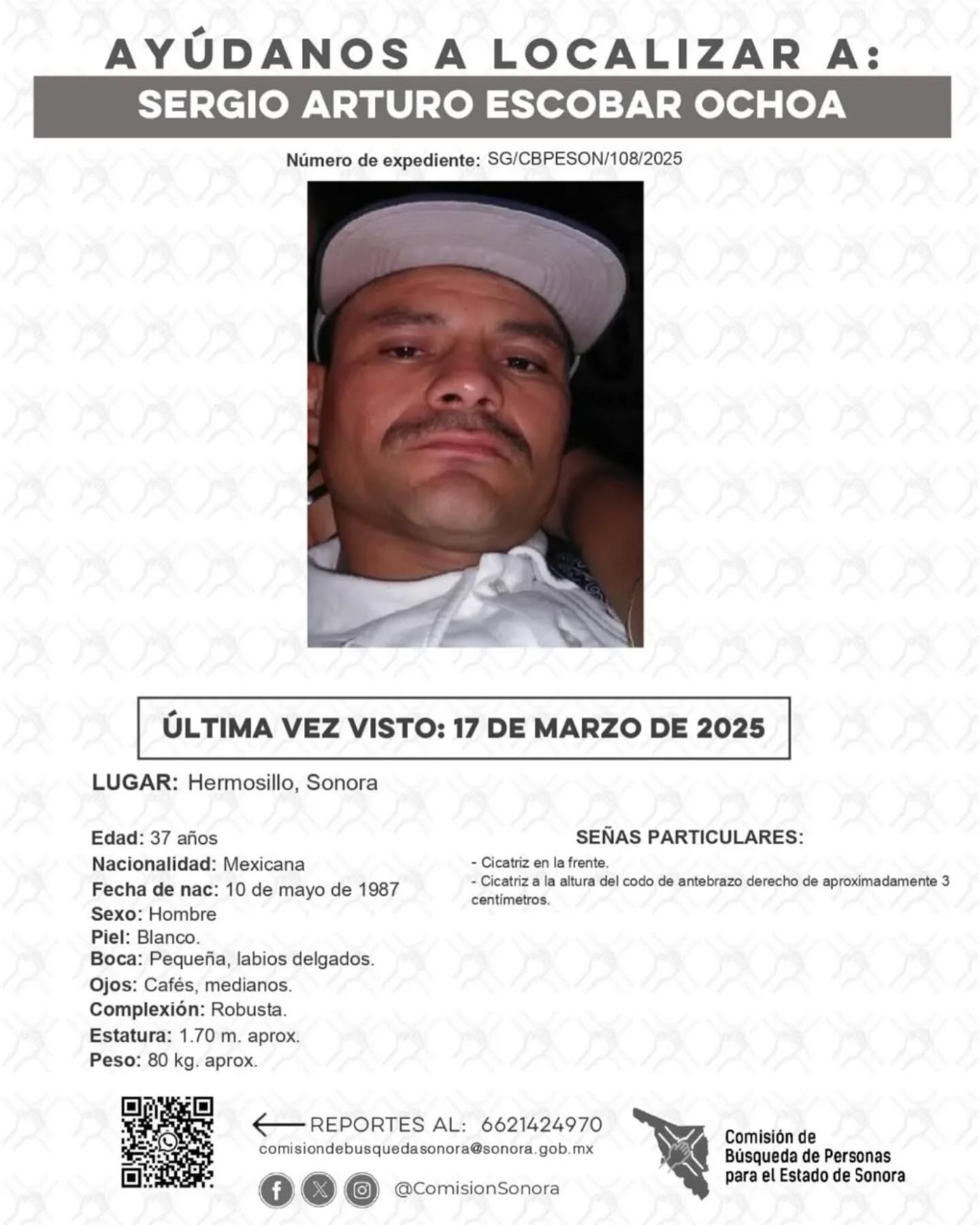 La Comisión de Búsqueda Para el Estado de Sonora solicita apoyo para localizar a SERGIO ARTURO ESCOBAR OCHOA.