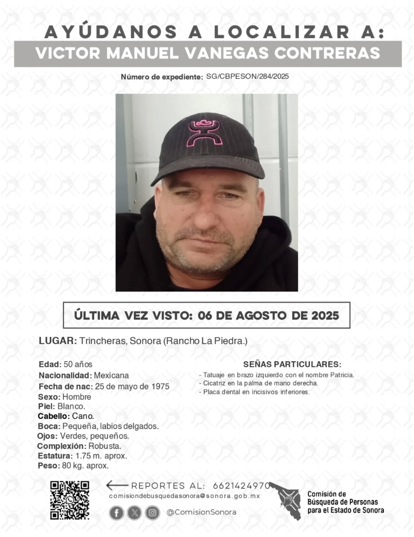 La Comisión de Búsqueda Para el Estado de Sonora solicita apoyo para localizar a VICTOR MANUEL VANEGAS CONTRERAS.