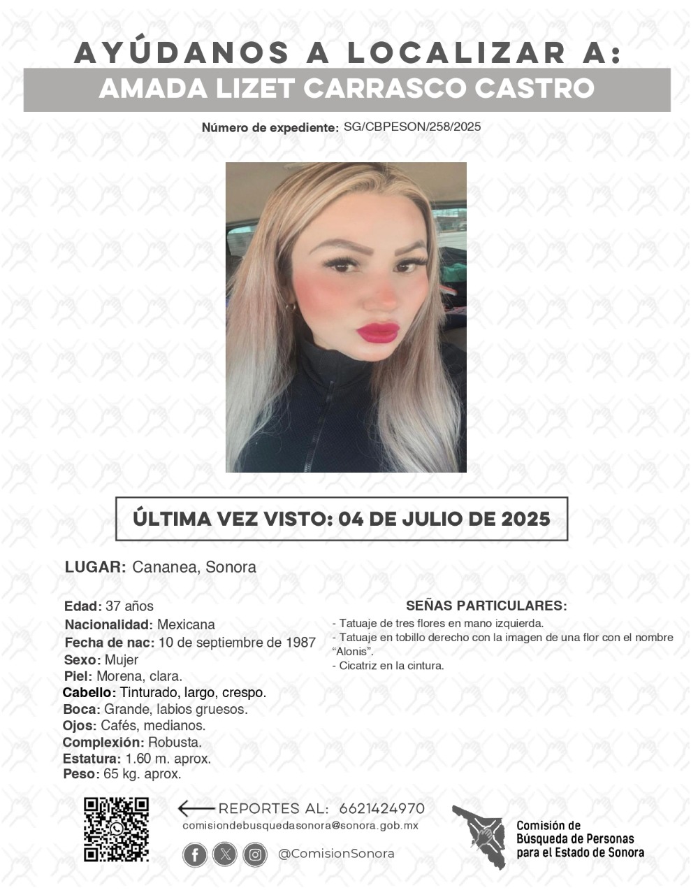 La Comisión de Búsqueda Para el Estado de Sonora solicita apoyo para localizar a AMADA LIZET CARRASCO CASTRO.