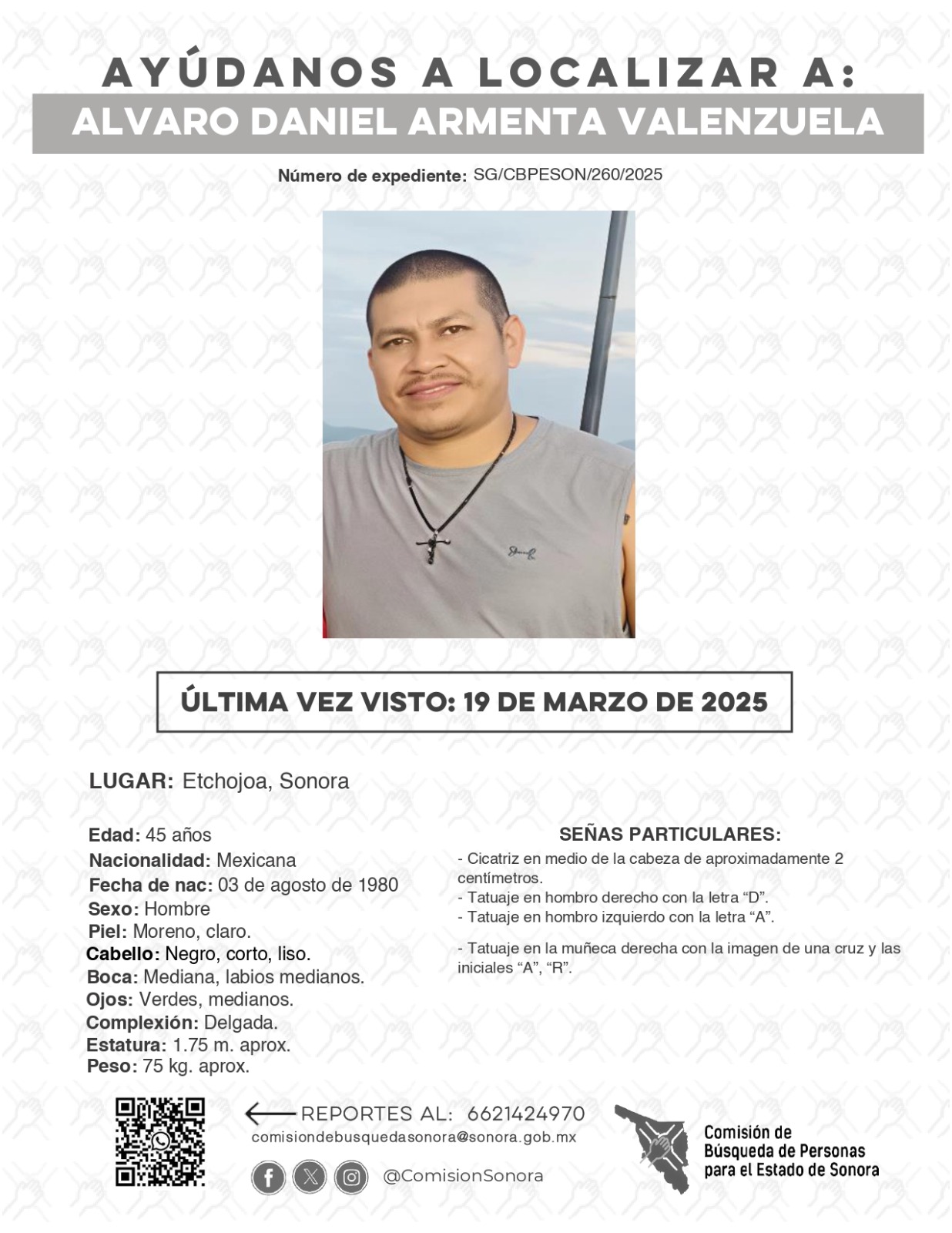 La Comisión de Búsqueda Para el Estado de Sonora solicita apoyo para localizar a ALVARO DANIEL ARMENTA VALENZUELA.