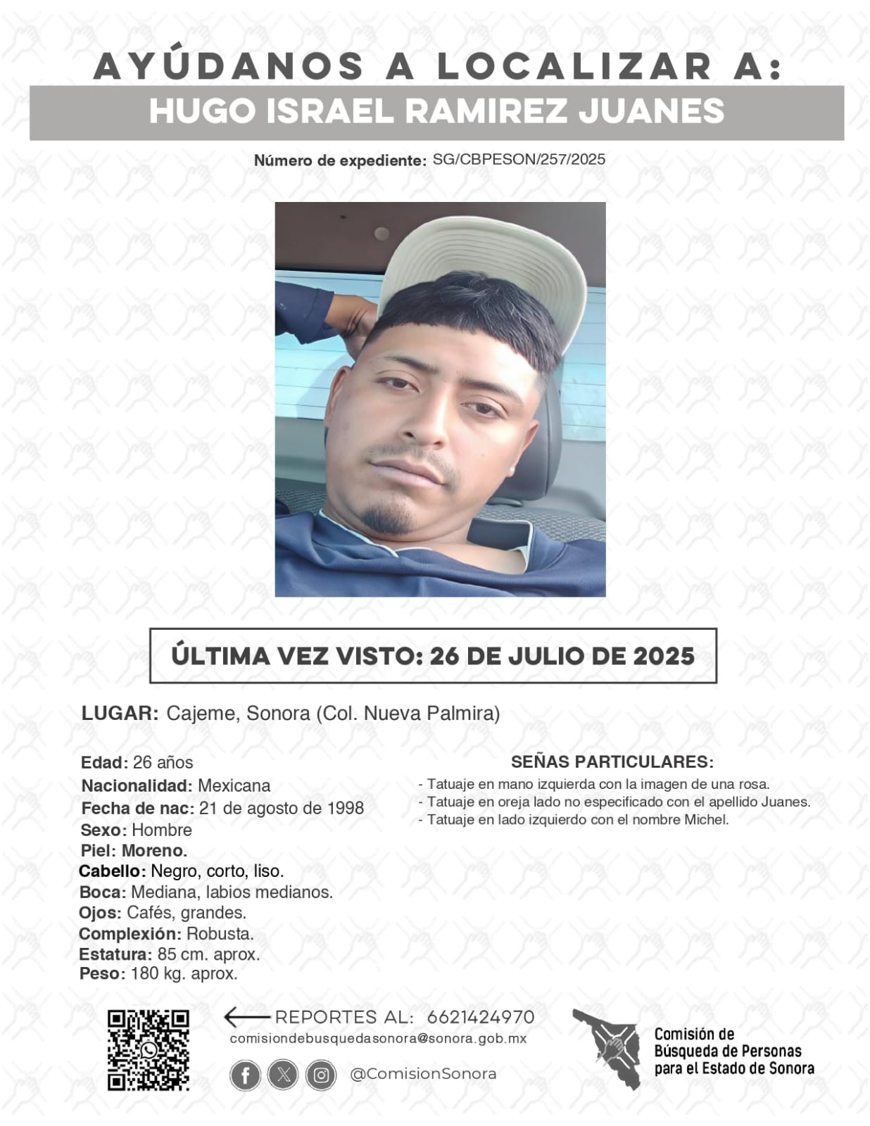 La Comisión de Búsqueda Para el Estado de Sonora solicita apoyo para localizar a HUGO ISRAEL RAMIREZ JUANES.