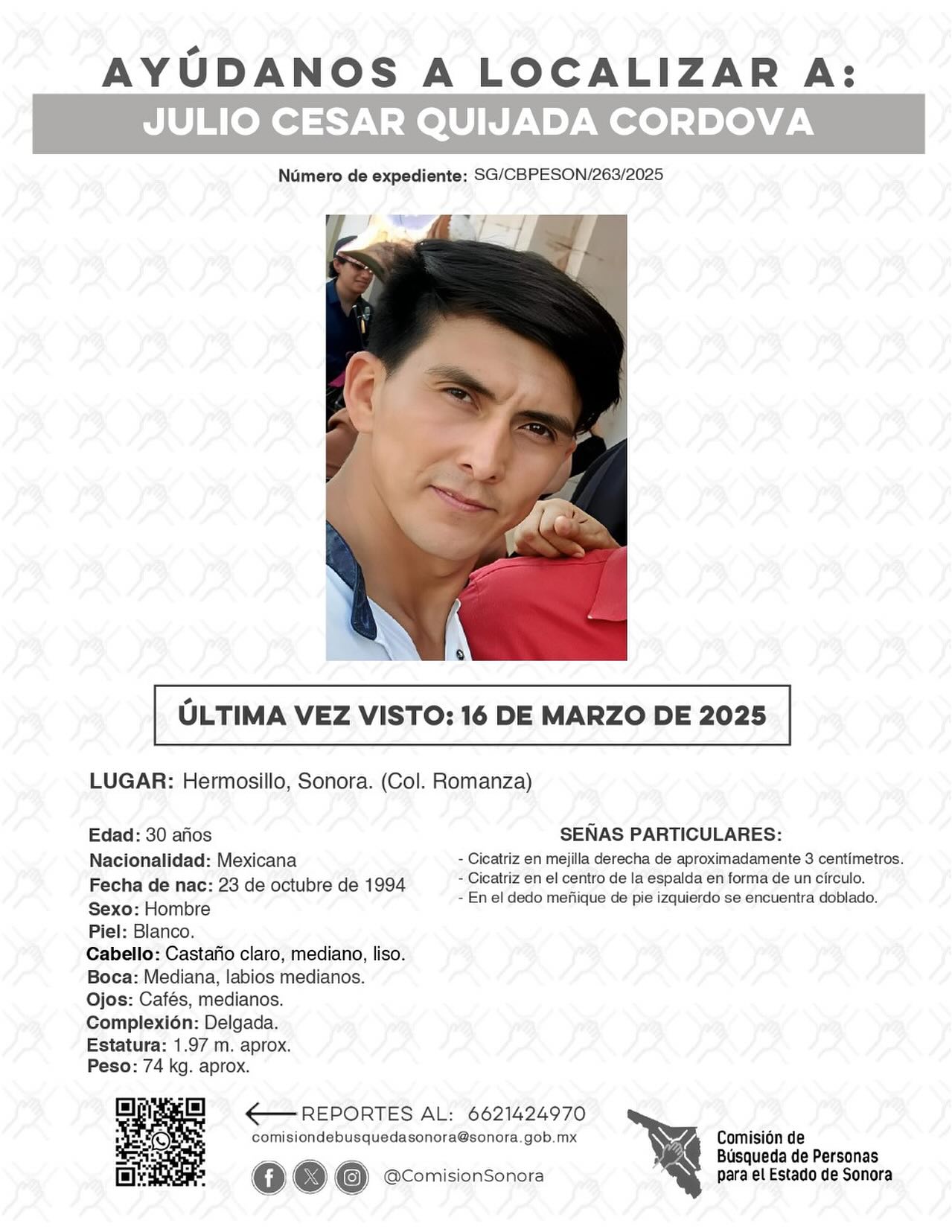 La Comisión de Búsqueda Para el Estado de Sonora solicita apoyo para localizar a JULIO CESAR QUIJADA CORDOVA.