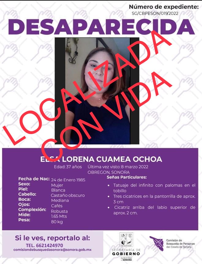 La Comisión de Búsqueda de Personas para el Estado de Sonora informa que, ALDARA LILEN TOVANI GASTELUM fue localizada afortunadamente con vida. "Toda persona tiene un hogar, ayudémosle a regresar".